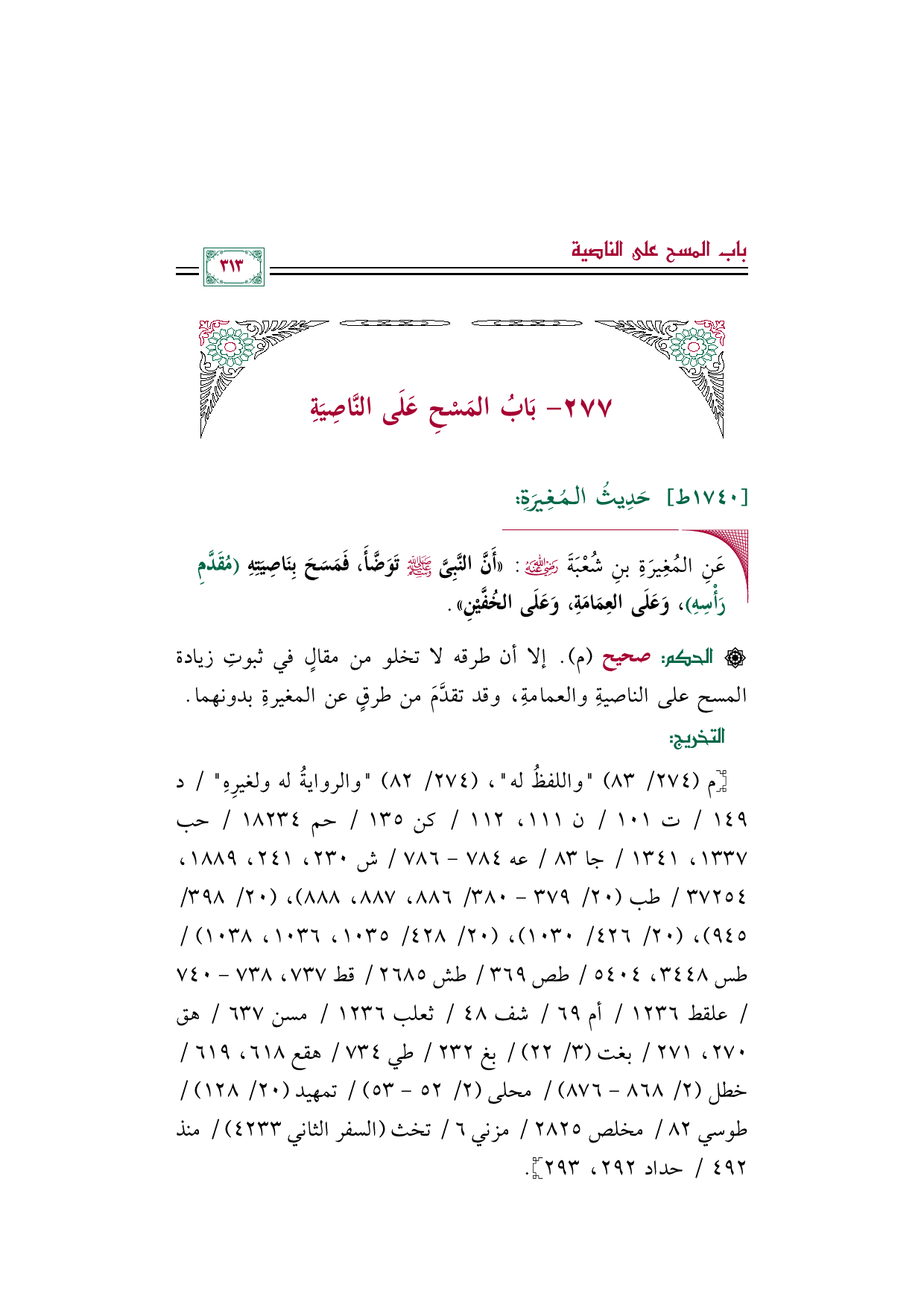 [الحكم]: صحيح (م). إلا أن طرقه لا تخلو من مقال في ثبوت زيادة المسح على الناصية والعمامة، وقد تقدم من طرقٍ عن المغيرة بدونهما.