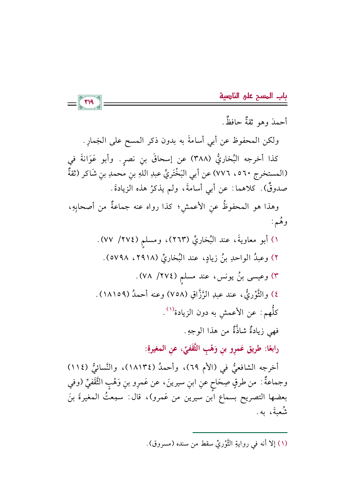 ولكن المحفوظ عن أبي أسامة به بدون ذكر المسح على الخِمار.