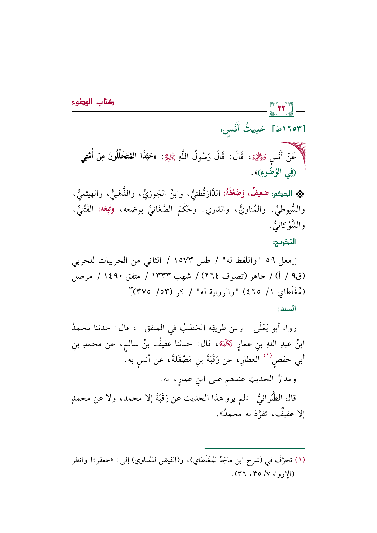 رواه أبو يَعْلَى -ومن طريقِه الخطيبُ في المتفق-، قال: حدثنا محمدُ بنُ عبدِ اللهِ بنِ عمارٍ رحمه الله، قال: حدثنا عفيفُ بنُ سالمٍ، عن محمدِ بنِ أبي حفصٍ (¬١) العطارِ، عن رَقَبَةَ بنِ مَصْقَلةَ، عن أنسٍ به.