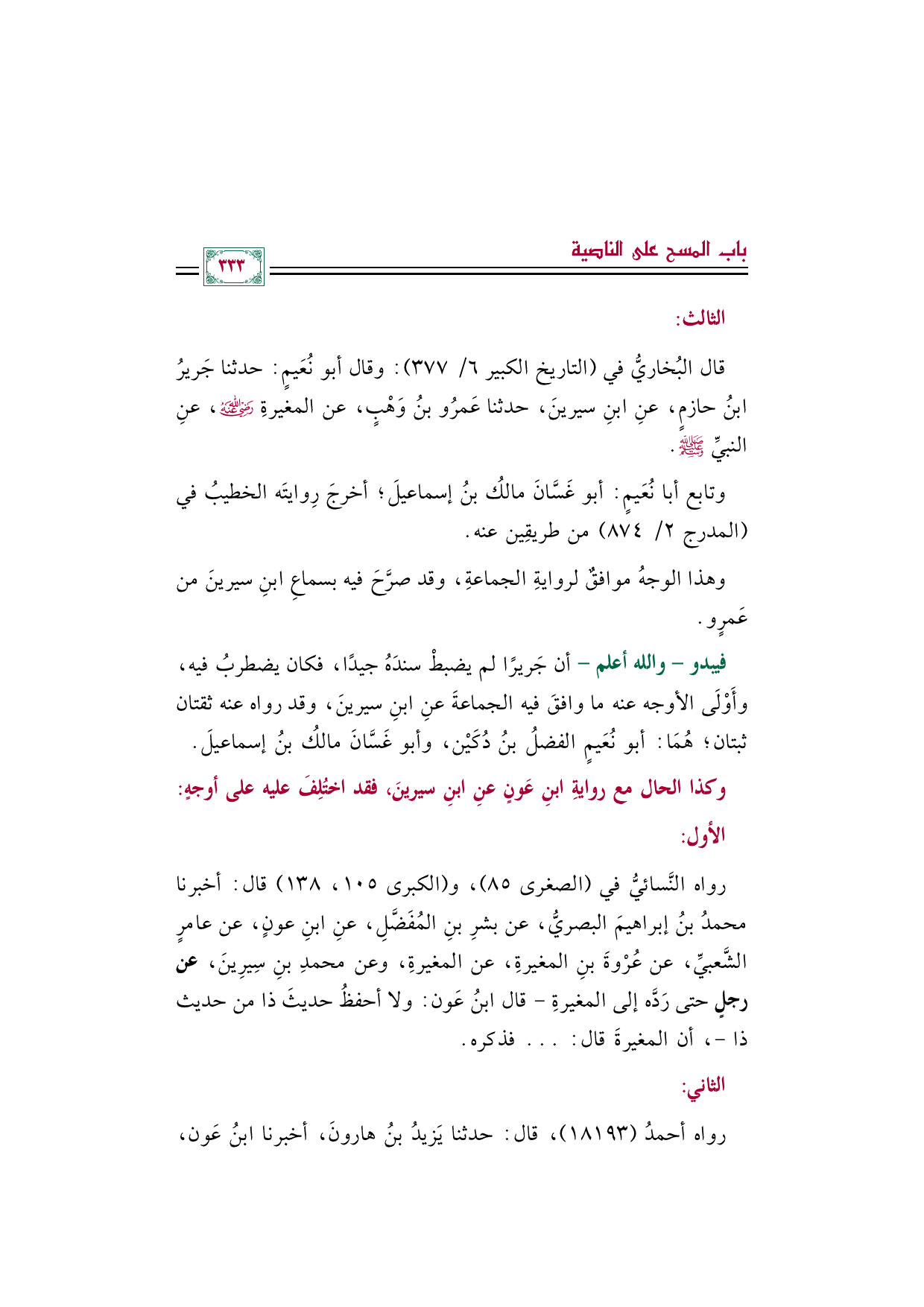 رواه النَّسائيُّ في (الصغرى ٨٥) و (الكبرى ١٠٥، ١٣٨) قال: أخبرنا محمد بن إبراهيم البصري، عن بشر بن المُفَضَّل، عنِ ابنِ عون، عن عامر الشَّعبي، عن عُرْوةَ بن المغيرة، عن المغيرة، وعن محمدِ بنِ سِيرِين، عن رجل حتى رَدَّه إلى المغيرة - قال ابنُ عَون: ولا أحفظ حديث ذا من حديث ذا -، أن المغيرة قال: ... فذكره.