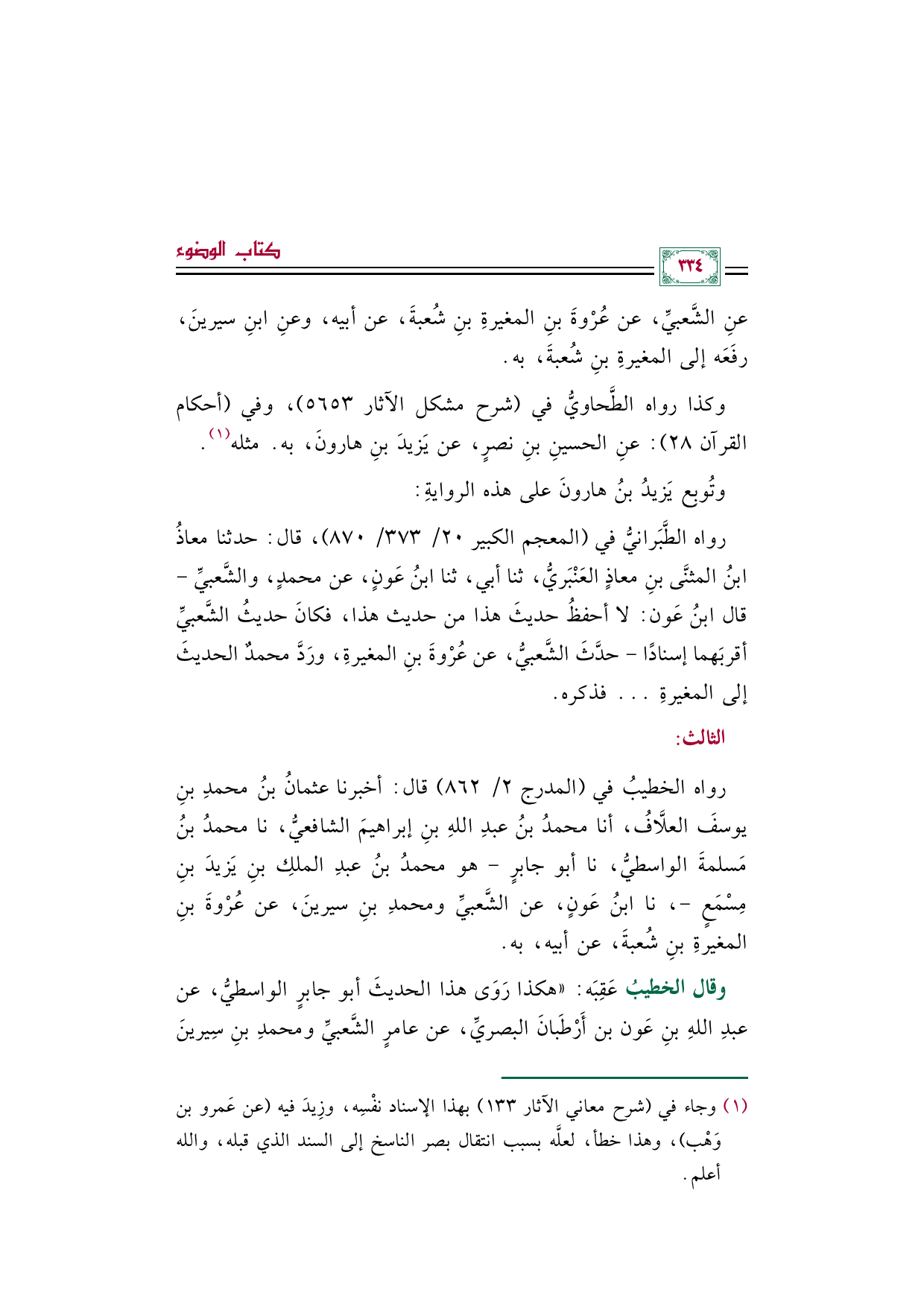 (¬١) وجاء في (شرح معاني الآثار ١٣٣) بهذا الإسناد نفْسِه، وزِيدَ فيه (عن عَمرو بن وَهْب)، وهذا خطأ، لعله بسبب انتقال بصر الناسخ إلى السند الذي قبله، والله أعلم.