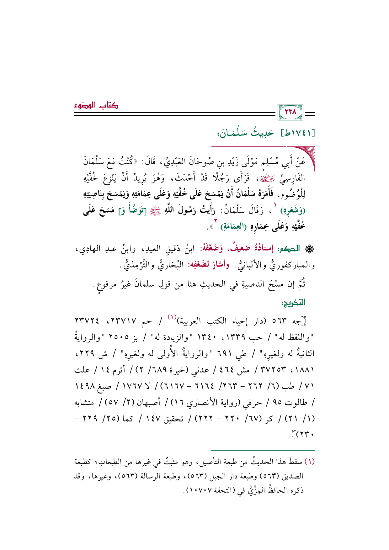 ◼ عَنْ أَبِي مُسْلِمٍ مَوْلَى زَيْدِ بْنِ صُوحَانَ العَبْدِيِّ، قَالَ: كُنْتُ مَعَ سَلْمَانَ الفَارِسِيِّ رضي الله عنه، فَرَأَى رَجُلًا قَدْ أَحْدَثَ، وَهُوَ يُرِيدُ أَنْ يَنْزِعَ خُفَّيْهِ لِلْوُضُوءِ، فَأَمَرَهُ سَلْمَانُ أَنْ يَمْسَحَ عَلَى خُفَّيْهِ وَعَلَى عِمَامَتِهِ وَيَمْسَحَ بِنَاصِيَتِهِ (وَشَعَرِهِ) ١، وَقَالَ سَلْمَانُ: رَأَيتُ رَسُولَ اللَّهِ صلى الله عليه وسلم [تَوَضَّأَ وَ] مَسَحَ عَلَى خُفَّيْهِ وَعَلَى خِمَارِهِ (العِمَامَةِ) ٢".