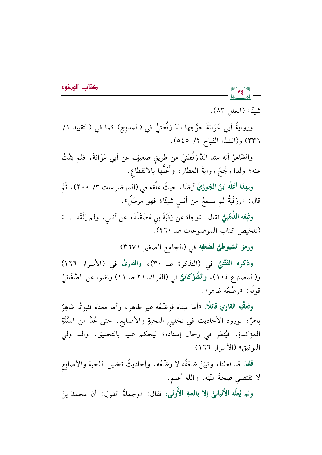وذكره الفَتَّنيُّ في (التذكرة صـ ٣٠)، والقاريُّ في (الأسرار ١٦٦) و (المصنوع ١٠٤)، والشَّوْكانيُّ في (الفوائد ٢١ صـ ١١) ونقلوا عن الصَّغَانيِّ قولَه: "وضْعُه ظاهر".