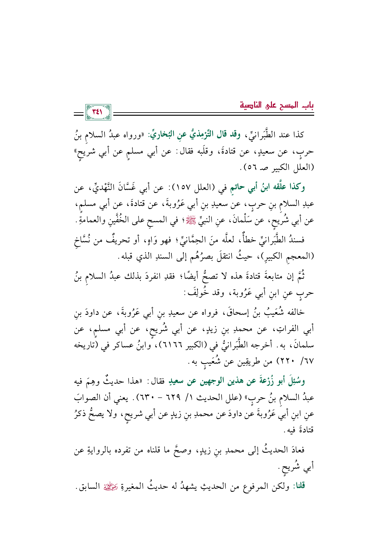 وكذا علَّقه ابن أبي حاتم في (العلل ١٥٧): عن أبي غَسَّان النَّهْدي، عن عبد السلام بن حرب، عن سعيد بن أبي عَرُوبة، عن قتادة، عن أبي مسلم، عن أبي شُريح، عن سَلْمان، عنِ النبيِّ صلى الله عليه وسلم؛ في المسح على الخفين والعمامة.