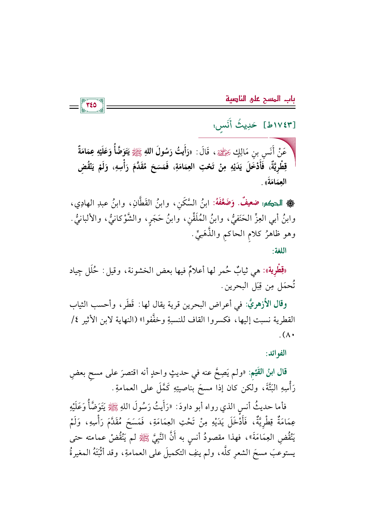 فأما حديث أنس الذي رواه أبو داودَ: «رَأَيتُ رَسُولَ اللهِ صلى الله عليه وسلم يَتَوَضَّأُ وَعَلَيْهِ عِمَامَةٌ قِطْرِيَّةٌ، فَأَدْخَلَ يَدَيْهِ مِنْ تَحْتِ العِمَامَةِ، فَمَسَحَ مُقَدَّمَ رَأْسِهِ، وَلَمْ يَنْقُضِ العِمَامَةَ»، فهذا مقصود أنس به أَنَّ النَّبِيَّ صلى الله عليه وسلم لم ينقض عمامته حتى يستوعب مسح الشعر كلَّه، ولم ينفِ التكميل على العمامة، وقد أثبته المغيرة
