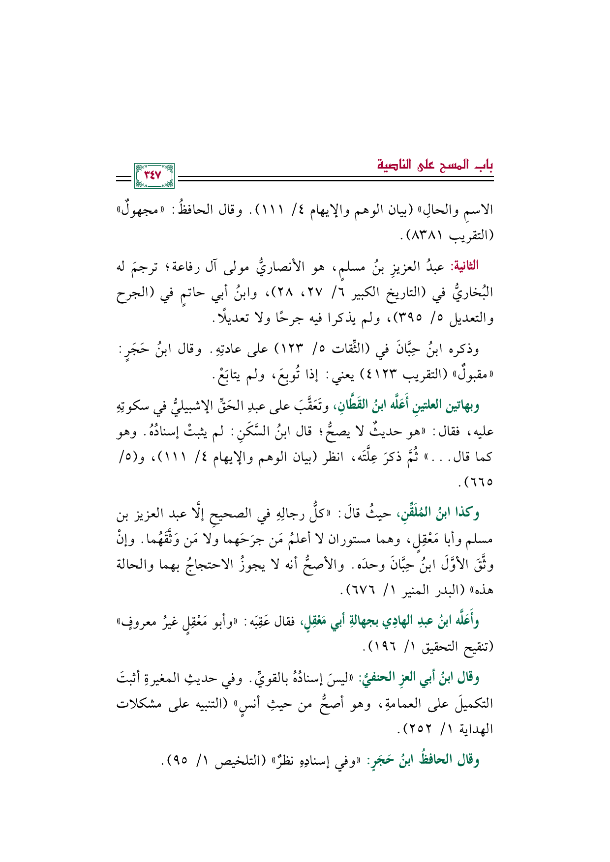 وقال ابنُ أبي العز الحنفي: "ليس إسناده بالقوي. وفي حديثِ المغيرة أثبت التكميل على العمامة، وهو أصح من حيث أنس" (التنبيه على مشكلات الهداية ١/ ٢٥٢).
