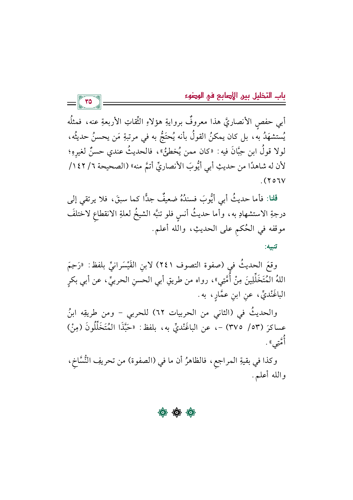 وقعَ الحديثُ في (صفوة التصوف ٢٤١) لابنِ القَيْسَرانيِّ بلفظ: «رَحِمَ اللهُ المُتَخَلِّلِينَ مِنْ أُمَّتِي»، رواه من طريقِ أبي الحسنِ الحربيِّ، عن أبي بكرٍ الباغَنْديِّ، عنِ ابنِ عمَّارٍ، به.