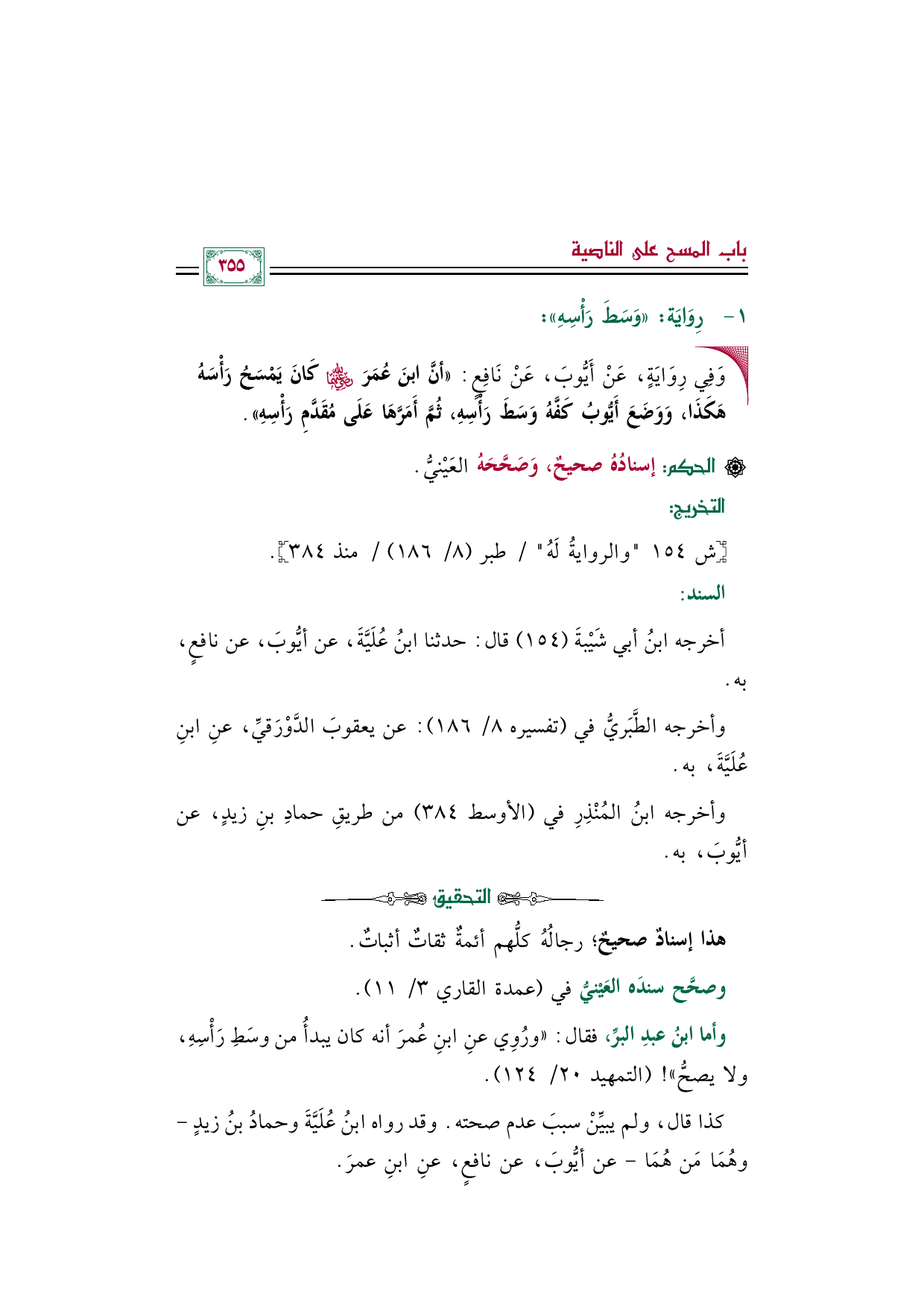 وأما ابن عبد البر، فقال: "ورُوِي عنِ ابنِ عُمرَ أنه كان يبدأ من وسَط رأسه، ولا يصح"! (التمهيد ٢٠/ ١٢٤).
