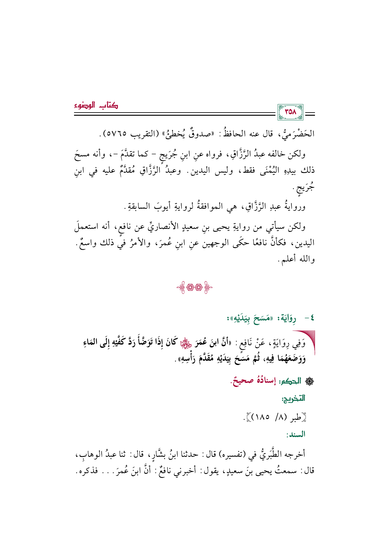 ولكن خالفه عبد الرَّزَّاقِ، فرواه عنِ ابنِ جُرَيجٍ - كما تقدم -، وأنه مسح ذلك بيده اليمنى فقط، وليس اليدين. ورواية وعبد الرَّزَّاقِ مُقدَّم عليه في ابن جُرَيجٍ.