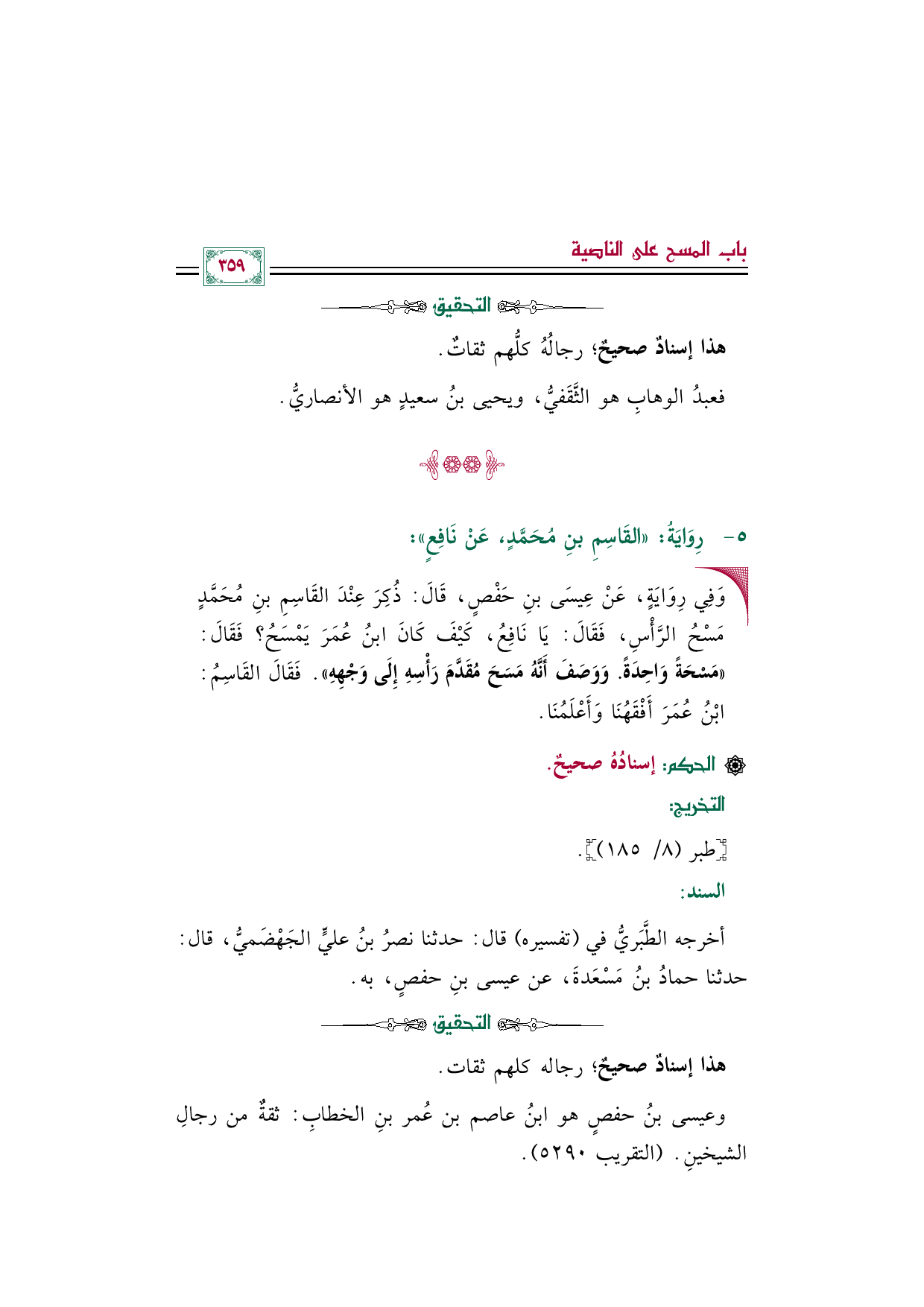• وَفِي رِوَايَةٍ، عَنْ عِيسَى بْنِ حَفْصٍ، قَالَ: ذُكِرَ عِنْدَ القَاسِمِ بْنِ مُحَمَّدٍ مَسْحُ الرَّأْسِ، فَقَالَ: يَا نَافِعُ، كَيْفَ كَأنَّ ابنَ عُمَرَ يَمْسَحُ؟ فَقَالَ: ((مَسْحَةً وَاحِدَةً. وَوَصَفَ أَنَّهُ مَسَحَ مُقَدَّمَ رَأْسِهِ إِلَى وَجْهِهِ)). فَقَالَ القَاسِمُ: ابْنُ عُمَرَ أَفْقَهُنَا وَأَعْلَمُنَا.