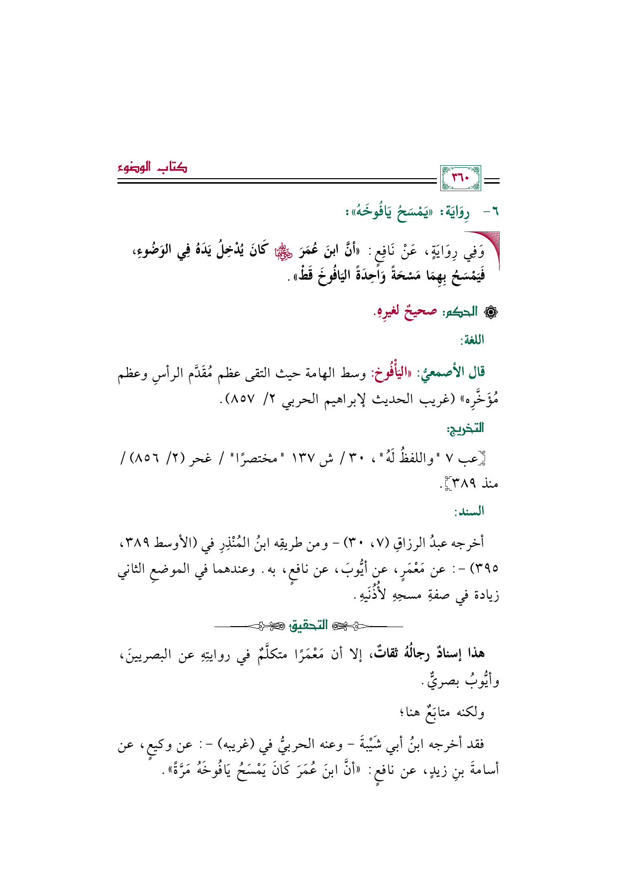 فقد أخرجه ابنُ أبي شَيْبةَ - وعنه الحربي في (غريبه) -: عن وكيع، عن أسامة بن زيد، عن نافع: ((أنَّ ابنَ عُمَرَ كَانَ يَمْسَحُ يَافُوخَهُ مَرَّةً)).