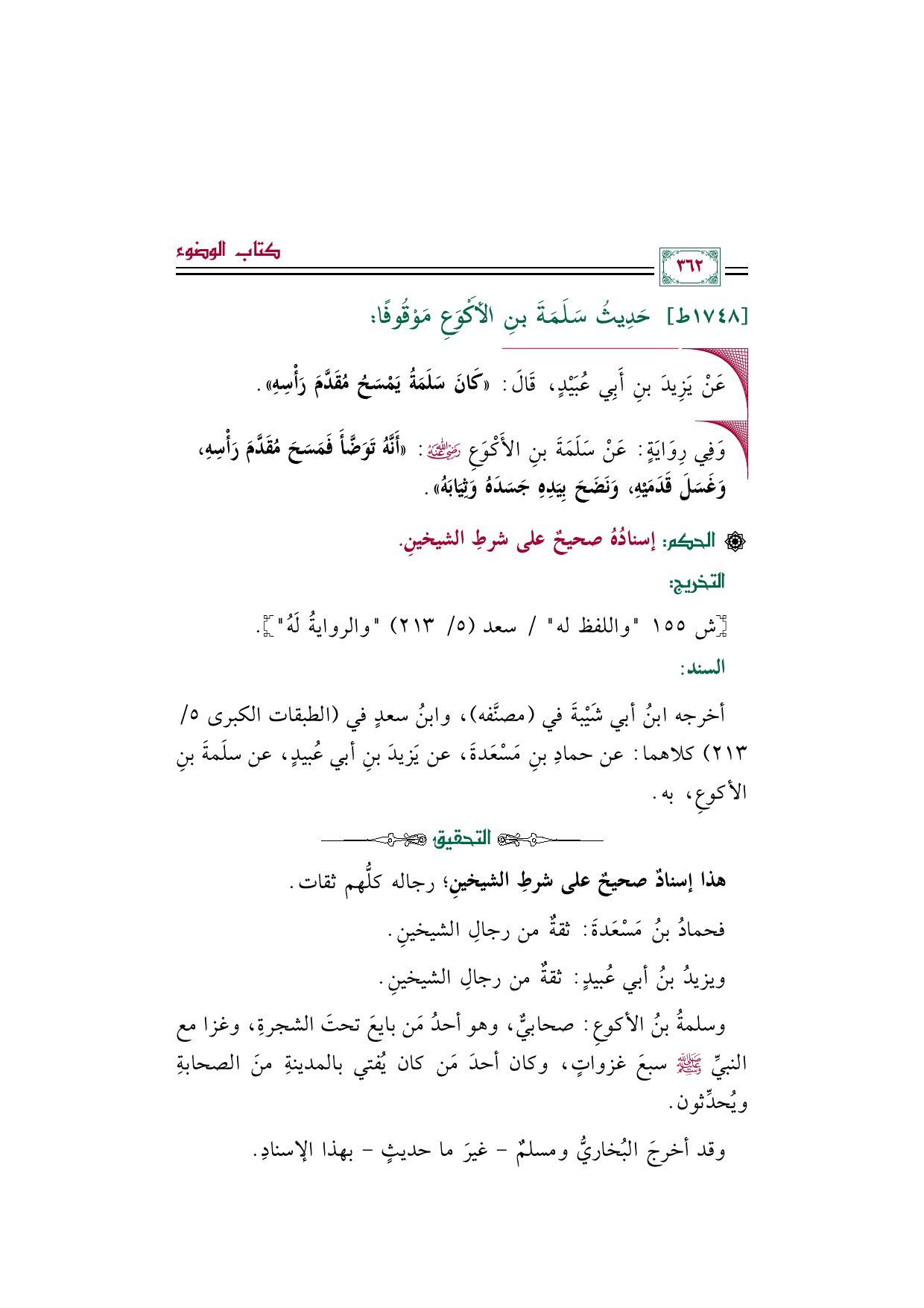 أخرجه ابنُ أبي شَيْبةَ في (مصنفه)، وابنُ سعدٍ في (الطبقات الكبرى ٥/ ٢١٣) كلاهما: عن حماد بن مَسْعَدة، عن يَزيدَ بن أبي عُبيد، عن سلَمة بن الأكوع، به.