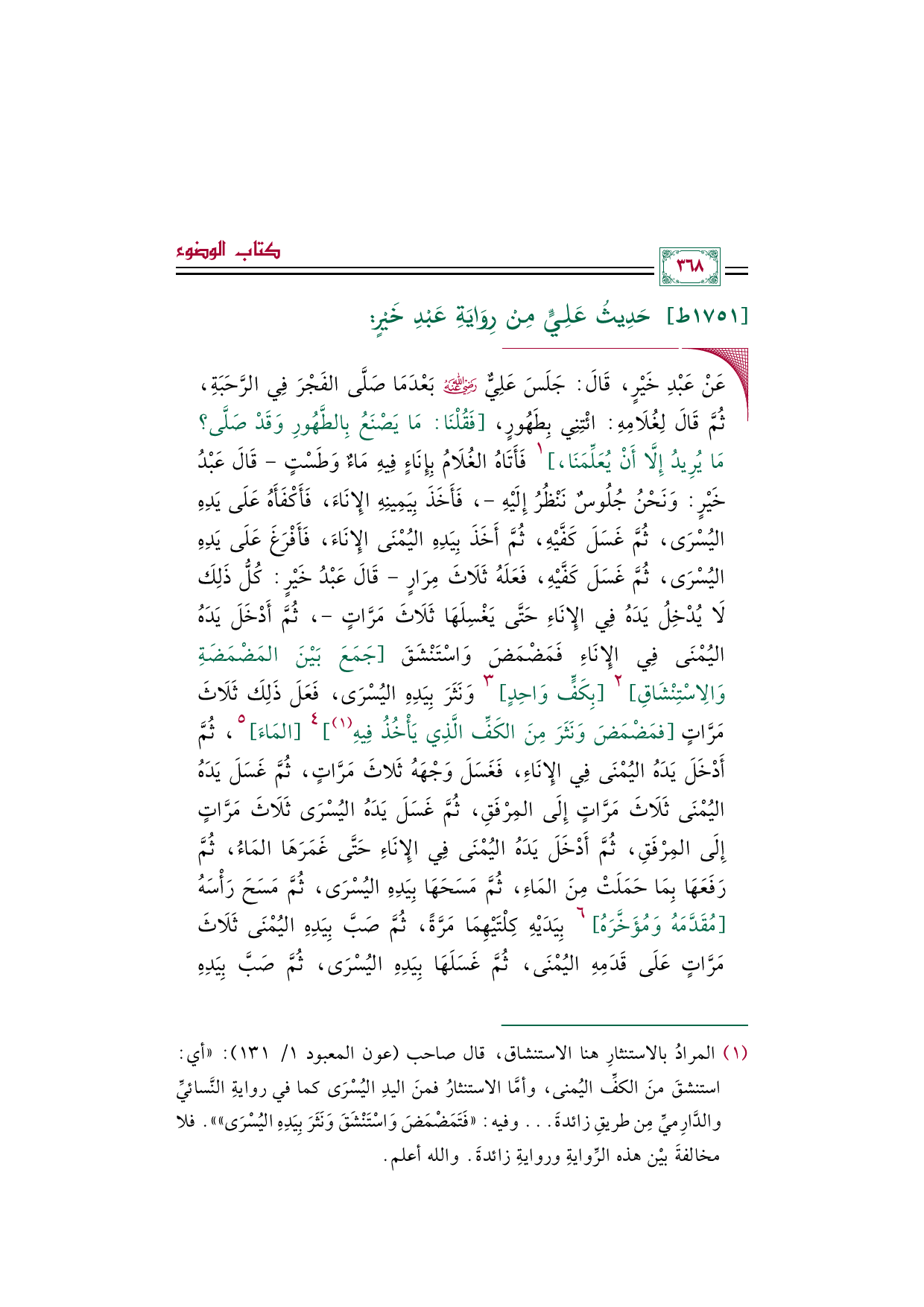 ◼ عَنْ عَبْدِ خَيْرٍ، قَالَ: جَلَسَ عَلِيٌّ رضي الله عنه بَعْدَمَا صَلَّى الفَجْرَ فِي الرَّحَبَةِ، ثُمَّ قَالَ لِغُلَامِهِ: ائْتِنِي بِطَهُورٍ، [فَقُلْنَا: مَا يَصْنَعُ بِالطَّهُورِ وَقَدْ صَلَّى؟ مَا يُرِيدُ إِلَّا أَنْ يُعَلِّمَنَا، ] ١ فَأَتَاهُ الْغُلَامُ بِإِنَاءٍ فِيهِ مَاءٌ وَطَسْتٍ - قَالَ عَبْدُ خَيْرٍ: وَنَحْنُ جُلُوسٌ نَنْظُرُ إِلَيْهِ -، فَأَخَذَ بِيَمِينِهِ الإِنَاءَ، فَأَكْفَأَهُ عَلَى يَدِهِ اليُسْرَى، ثُمَّ غَسَلَ كَفَّيْهِ، ثُمَّ أَخَذَ بِيَدِهِ اليُمْنَى الإِنَاءَ، فَأَفْرَغَ عَلَى يَدِهِ اليُسْرَى، ثُمَّ غَسَلَ كَفَّيْهِ، فَعَلَهُ ثَلَاثَ مِرَارٍ - قَالَ عَبْدُ خَيْرٍ: كُلُّ ذَلِكَ لَا يُدْخِلُ يَدَهُ فِي الإِنَاءِ حَتَّى يَغْسِلَهَا ثَلَاثَ مَرَّاتٍ -، ثُمَّ أَدْخَلَ يَدَهُ اليُمْنَى فِي الإِنَاءِ فَمَضْمَضَ وَاسْتَنْشَقَ [جَمَعَ بَيْنَ المَضْمَضَةِ وَالِاسْتِنْشَاقِ] ٢ [بِكَفٍّ وَاحِدٍ] ٣ وَنَثَرَ بِيَدِهِ اليُسْرَى، فَعَلَ ذَلِكَ ثَلَاثَ مَرَّاتٍ [فمَضْمَضَ وَنَثَرَ مِنَ الْكَفِّ الَّذِي يَأْخُذُ فِيهِ (¬١)]