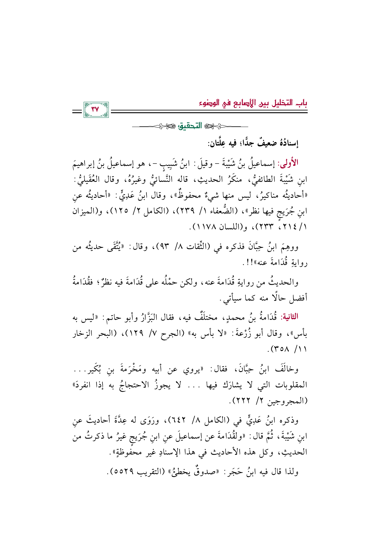 الأولى: إسماعيلُ بنُ شَيْبةَ -وقيلَ: ابنُ شَبِيبٍ-، هو إسماعيلُ بنُ إبراهيمَ بنِ شَيْبةَ الطائفيُّ، منكَرُ الحديثِ، قاله النَّسائيُّ وغيرُهُ، وقال العُقَيليُّ: "أحاديثُه مناكيرُ، ليس منها شيءٌ محفوظٌ"، وقال ابنُ عَدِيٍّ: "أحاديثُه عنِ ابنِ جُرَيجٍ فيها نظر"، (الضُّعفاء ١/ ٢٣٩)، (الكامل ٢/ ١٢٥)، و (الميزان ١/ ٢١٤، ٢٣٣)، و (اللسان ١١٧٨).