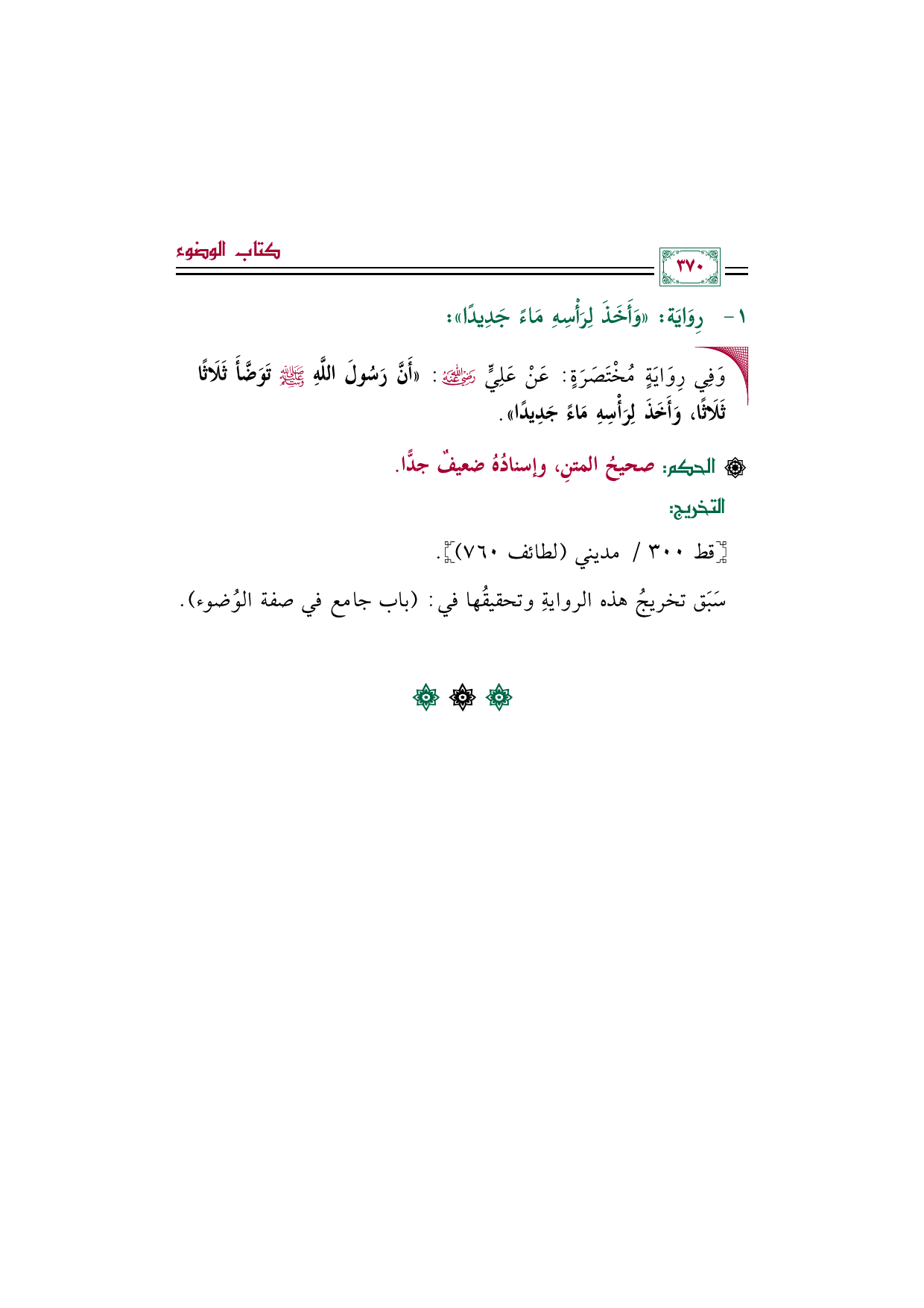 • وَفِي رِوَايَةٍ مُخْتَصَرَةٍ: عَنْ عَلِيٍّ رضي الله عنه: ((أَنَّ رَسُولَ اللَّهِ صلى الله عليه وسلم تَوَضَّأَ ثَلَاثًا ثَلَاثًا، وَأَخَذَ لِرَأْسِهِ مَاءً جَدِيدًا)).