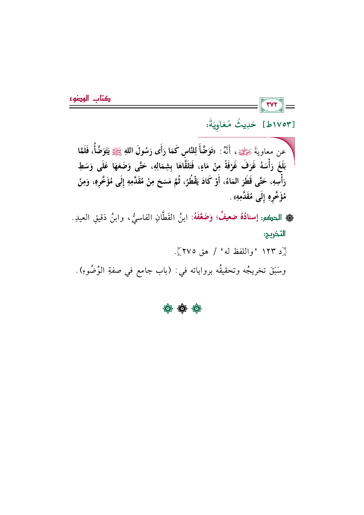 ◼ عَنْ مُعَاوِيَةَ رضي الله عنه، أَنَّهُ: ((تَوَضَّأَ لِلنَّاسِ كَمَا رَأَى رَسُولَ اللهِ صلى الله عليه وسلم يَتَوَضَّأُ، فَلَمَّا بَلَغَ رَأْسَهُ غَرَفَ غَرْفَةً مِنْ مَاءٍ، فَتَلَقَّاهَا بِشِمَالِهِ، حَتَّى وَضَعَهَا عَلَى وَسَطِ رَأْسِهِ، حَتَّى قَطَرَ المَاءُ، أَوْ كَادَ يَقْطُرُ، ثُمَّ مَسَحَ مِنْ مُقَدَّمِهِ إِلَى مُؤَخَّرِهِ، وَمِنْ مُؤَخَّرِهِ إِلَى مُقَدَّمِهِ)).