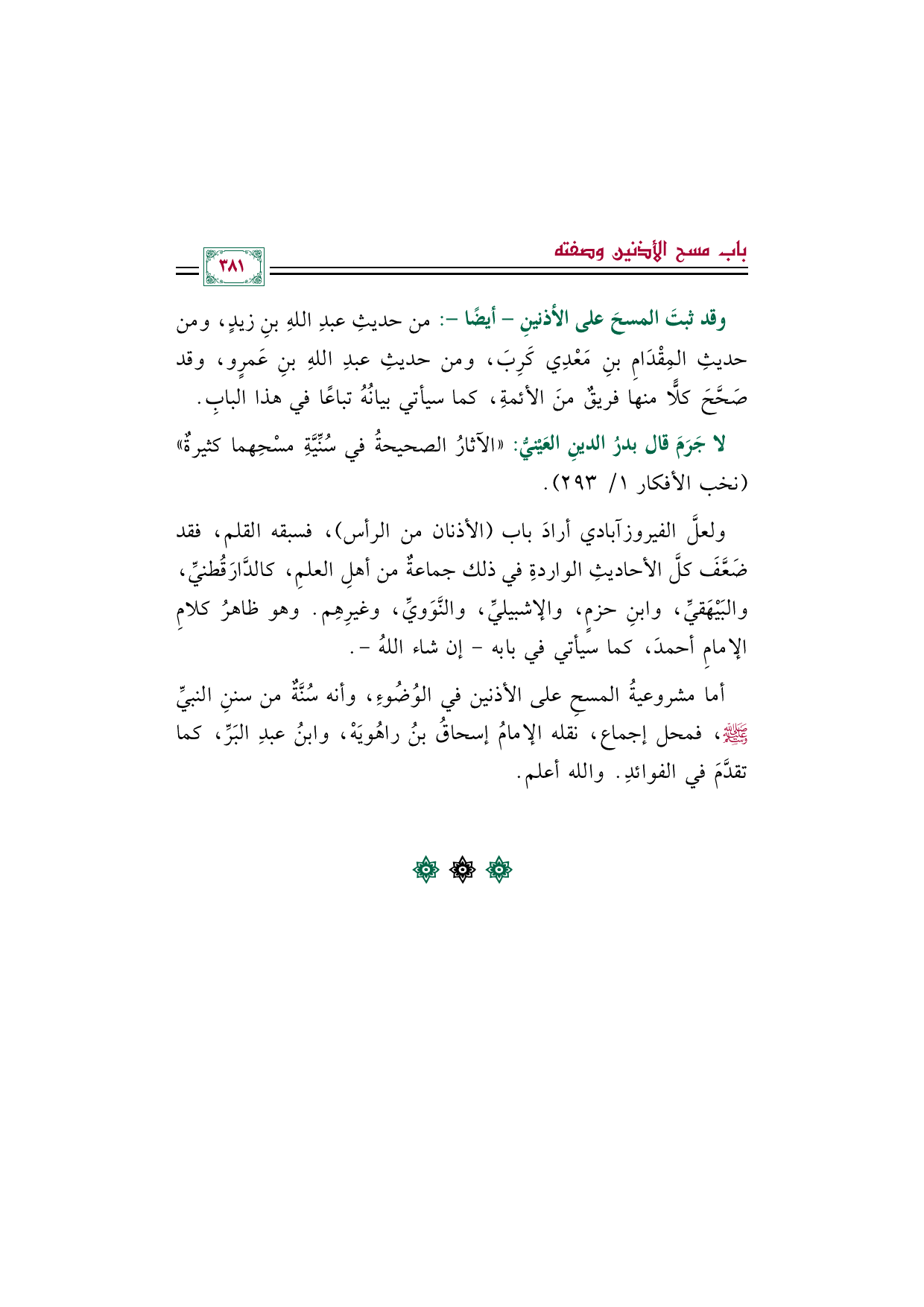 ولعل الفيروزآبادي أراد باب (الأذنان من الرأس)، فسبقه القلم، فقد ضعف كل الأحاديث الواردة في ذلك جماعة من أهلِ العلمِ، كالدَّارَقُطنيّ والبَيْهَقيُّ وابنُ حزم والإشبيلي والنَّوَويُّ وغيرهم. وهو ظاهرُ كلامِ الإمام أحمد، كما سيأتي في بابه - إن شاء الله -.