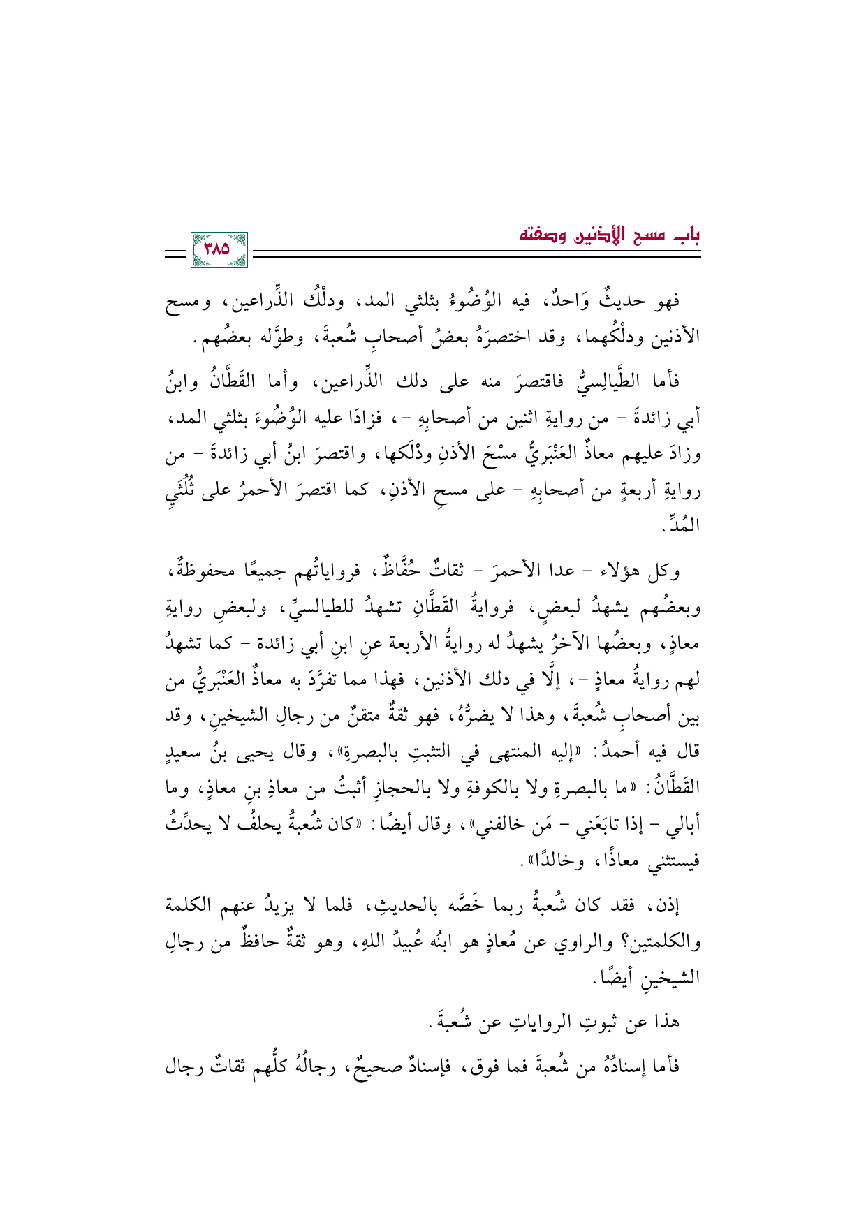 وكل هؤلاء - عدا الأحمرَ - ثقات حُفَّاظ، فرواياتهم جميعًا محفوظة، وبعضهم يشهد لبعض، فرواية القَطَّان تشهد للطيالسي، ولبعض رواية معاذ، وبعضها الآخر يشهد له رواية الأربعة عنِ ابنِ أبي زائدة - كما تشهد لهم رواية معاذ -، إلا في دلك الأذنين، فهذا مما تفرد به معاذٌ العَنْبَريُّ من بين أصحاب شُعبة، وهذا لا يضره، فهو ثقة متقن من رجال الشيخينِ، وقد قال فيه أحمد: "إليه المنتهى في التثبت بالبصرة"، وقال يحيى بن سعيد القَطَّان: "ما بالبصرة ولا بالكوفة ولا بالحجاز أثبت من معاذ بن معاذ، وما أبالي - إذا تابَعَني - مَن خالفني"، وقال أيضًا: "كان شُعبةُ يحلف لا يحدِّث فيستثني معاذًا، وخالدًا".