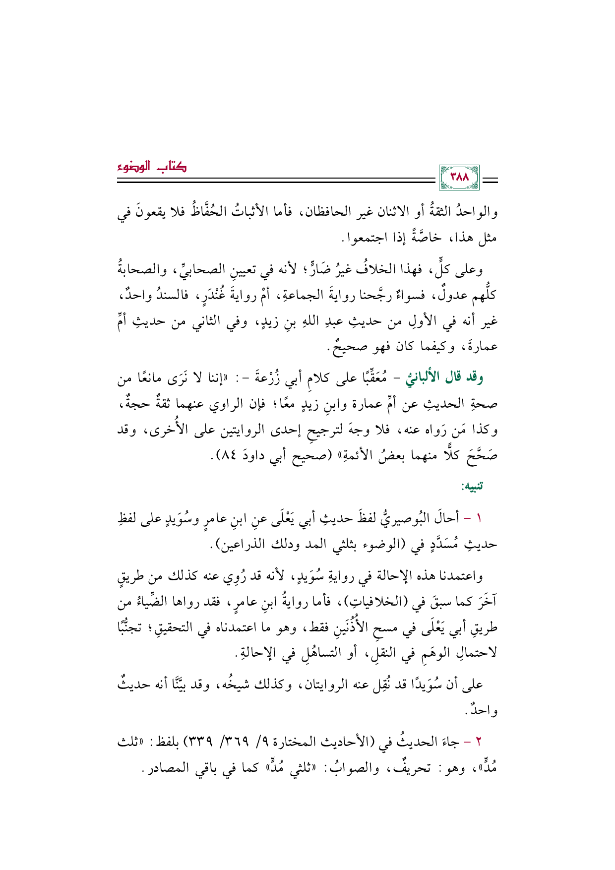 وقد قال الألبانيُّ - مُعَقِّبًا على كلام أبي زُرْعةَ -: "إننا لا نرى مانعًا من صحة الحديث عن أم عمارة وابنُ زيد معًا؛ فإن الراوي عنهما ثقة حجة، وكذا من رواه عنه، فلا وجه لترجيح إحدى الروايتين على الأخرى، وقد صحح كلًّا منهما بعضُ الأئمة" (صحيح أبي داودَ ٨٤).