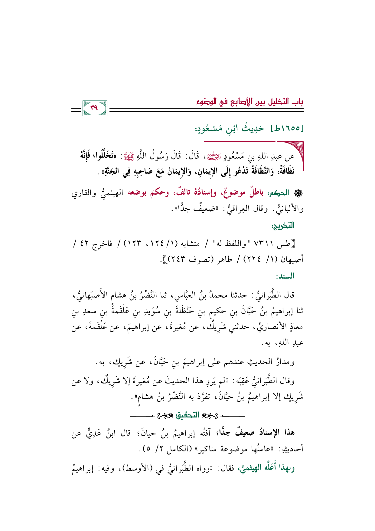 قال الطَّبَرانيُّ: حدثنا محمدُ بنُ العبَّاسِ، ثنا النَّضْرُ بنُ هشامٍ الأَصبَهانيُّ، ثنا إبراهيمُ بنُ حَيَّانَ بنِ حكيمِ بنِ حَنْظَلةَ بنِ سُوَيدِ بنِ عَلْقَمةَ بنِ سعدِ بنِ معاذٍ الأنصاريِّ، حدثني شَرِيكٌ، عن مُغيرةَ، عن إبراهيمَ، عن عَلْقَمةَ، عن عبدِ اللهِ، به.