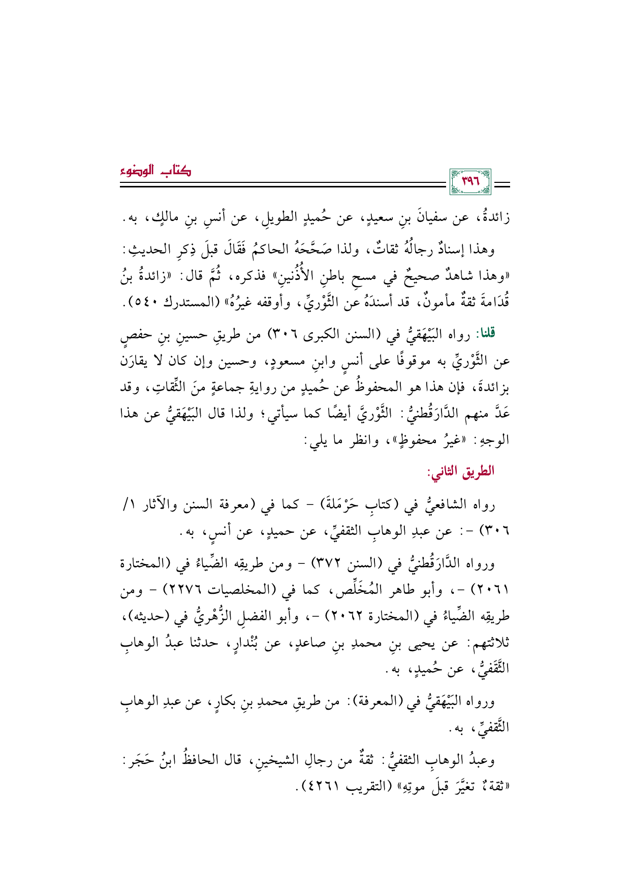 قلنا: رواه البَيْهَقيُّ في (السنن الكبرى ٣٠٦) من طريقِ حسين بن حفص عن الثَّوْريِّ به موقوفًا على أنس وابنُ مسعود، وحسين وإن كان لا يقارَن بزائدةَ، فإن هذا هو المحفوظُ عن حُميد من رواية جماعة منَ الثِّقاتِ، وقد عَدَّ منهم الدَّارَقُطنيُّ: الثَّوْريَّ أيضًا كما سيأتي؛ ولذا قال البَيْهَقيُّ عن هذا الوجه: "غير محفوظ"، وانظر ما يلي: