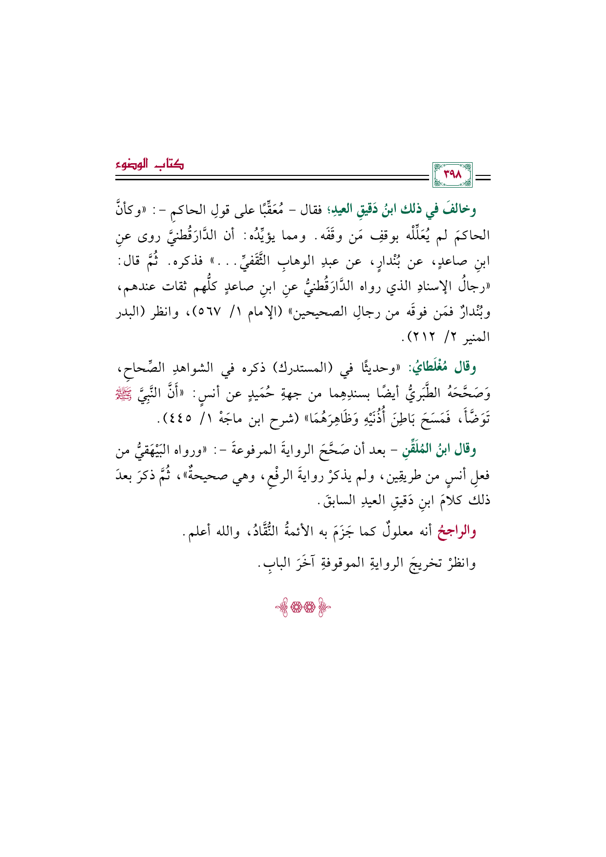 وخالف في ذلك ابنُ دقيقِ العيدِ؛ فقال - مُعَقِّبًا على قولِ الحاكمُ -: "وكأن الحاكمَ لم يُعَلِّلْه بوقفِ مَن وقَفَه. ومما يؤيِّدُه: أن الدَّارَقُطنيَّ روى عنِ ابنِ صاعد، عن بُنْدار، عن عبد الوهاب الثَّقَفي ... " فذكره. ثُمَّ قال: "رجال الإسناد الذي رواه الدَّارَقُطنيُّ عنِ ابنِ صاعدٍ كلُّهم ثقات عندهم، وبُنْدارٌ فمَن فوقَه من رجال الصحيحين" (الإمام ١/ ٥٦٧)، وانظر (البدر المنير ٢/ ٢١٢).