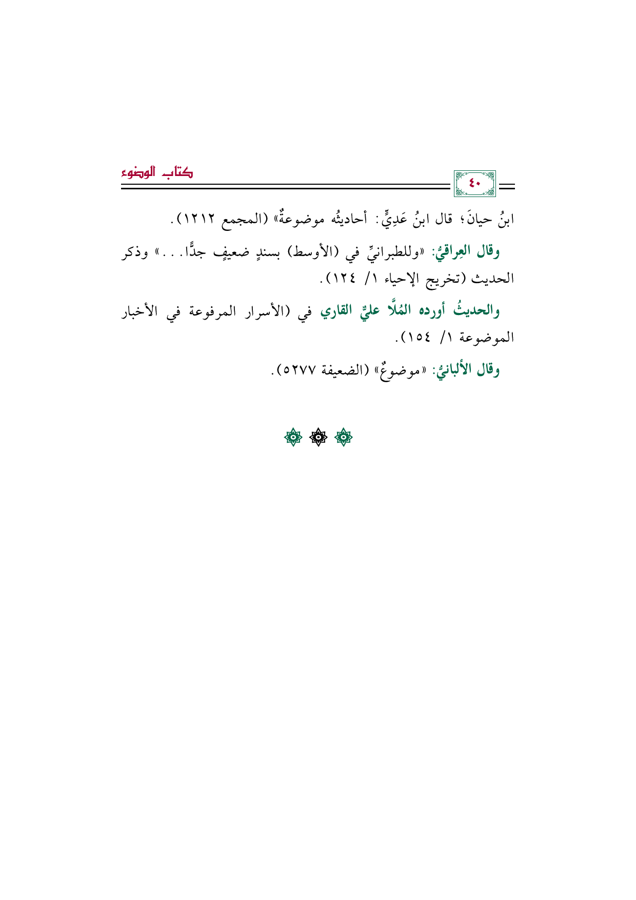 وقال العِراقيُّ: "وللطبرانيِّ في (الأوسط) بسندٍ ضعيفٍ جدًّا ... " وذكر الحديث (تخريج الإحياء ١/ ١٢٤).