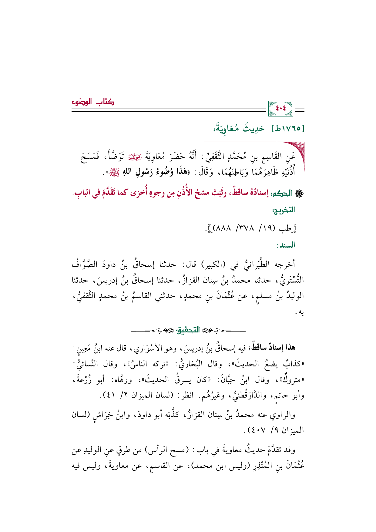 ◼ عَنِ القَاسِمِ بْنِ مُحَمَّدٍ الثَّقَفِيِّ: أَنَّهُ حَضَرَ مُعَاوِيَةَ رضي الله عنه تَوَضَّأَ، فَمَسَحَ أُذُنَيْهِ ظَاهِرَهُمَا وَبَاطِنَهُمَا، وَقَالَ: «هَذَا وُضُوءُ رَسُولِ اللهِ صلى الله عليه وسلم».