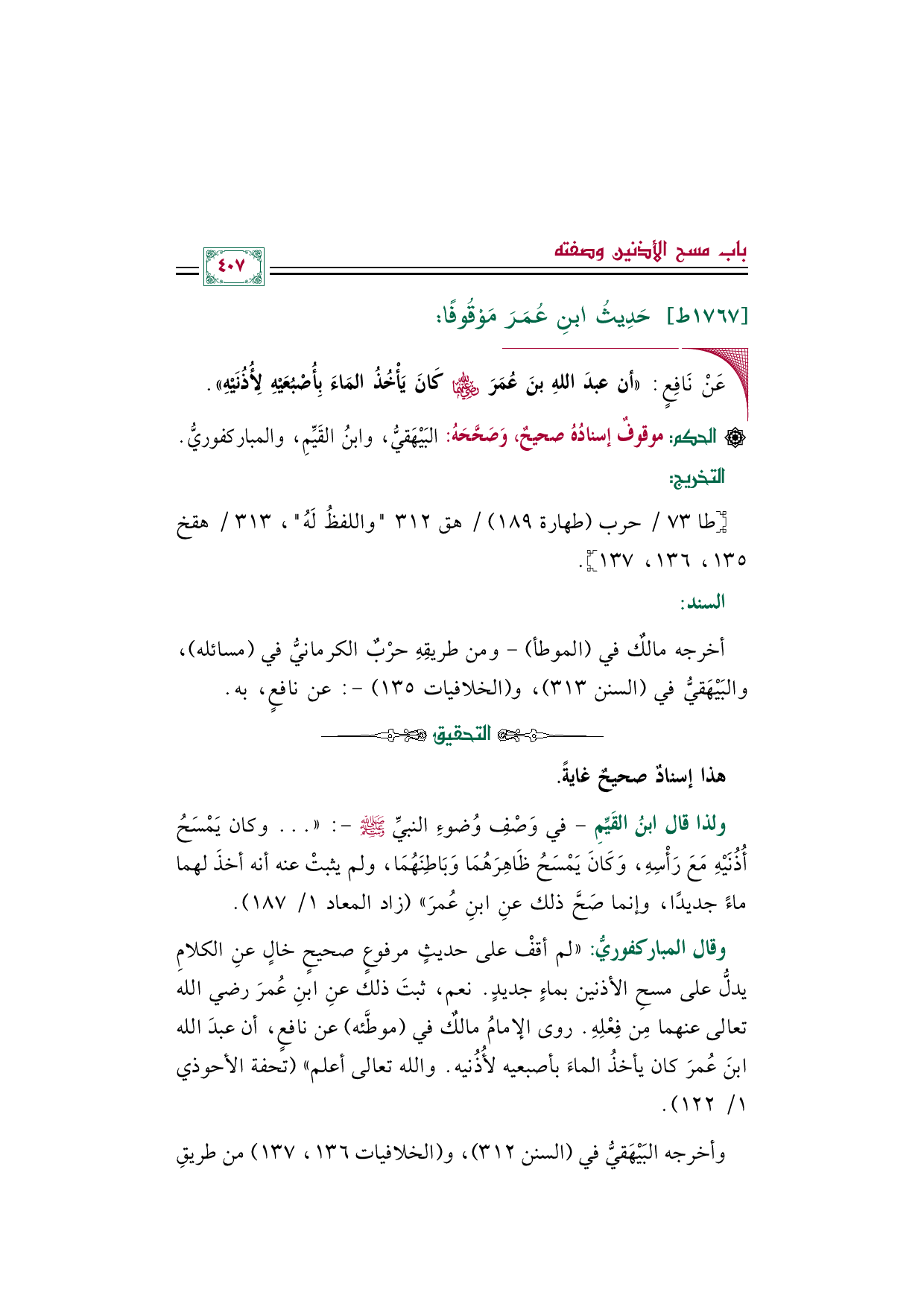وقال المباركفورى: "لم أقف على حديث مرفوع صحيح خالٍ عن الكلام يدل على مسح الأذنين بماءٍ جديد. نعم، ثبت ذلك عنِ ابنِ عُمرَ رضي الله تعالى عنهما مِن فِعْلِه. روى الإمام مالكٌ في موطَّئه عن نافع، أن عبدَ الله بن عُمرَ كان يأخذ الماء بأصبعيه لأذنيه. والله تعالى أعلم" (تحفة الأحوذي ١/ ١٢٢).