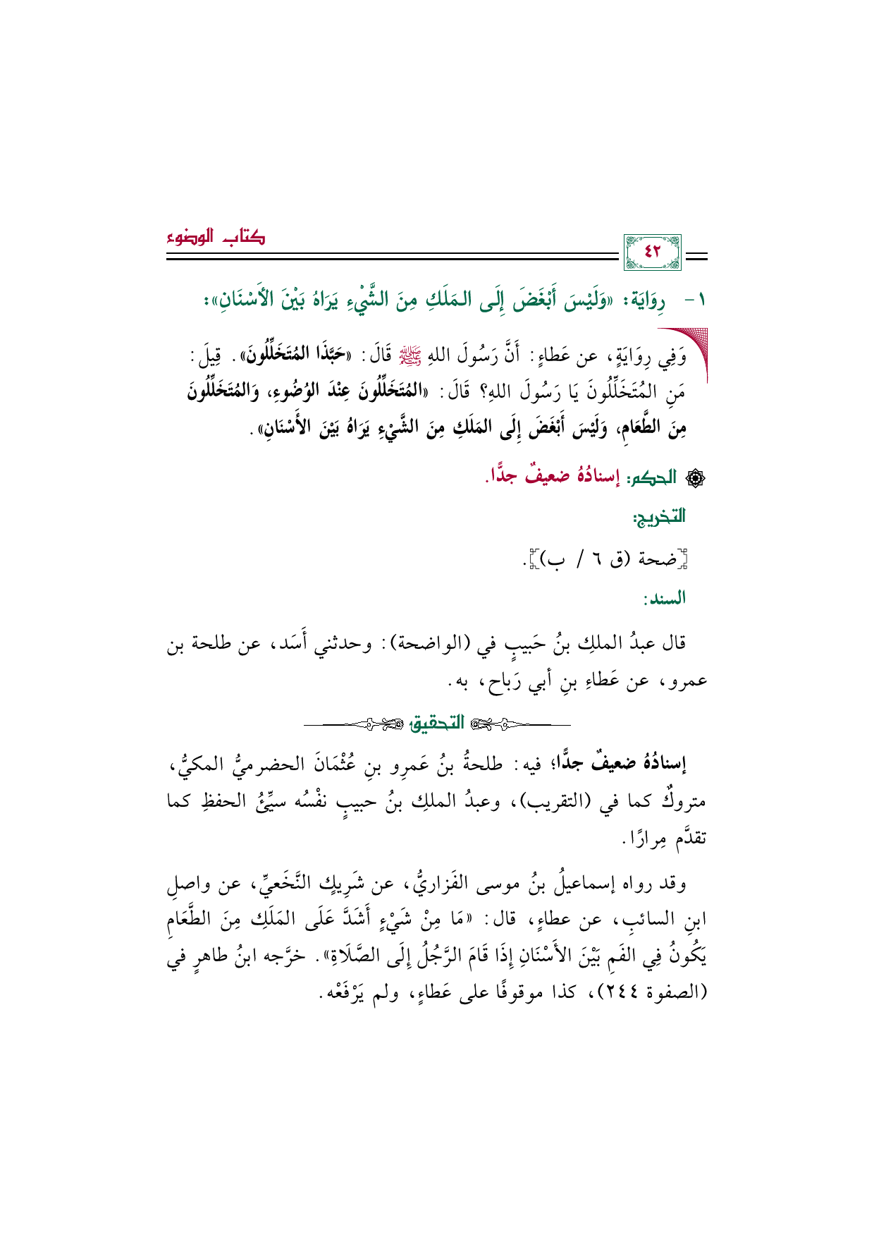قال عبدُ الملكِ بنُ حَبيبٍ في (الواضحة): وحدثني أَسَد، عن طلحة بن عمرو، عن عَطاءِ بنِ أبي رَباح، به.