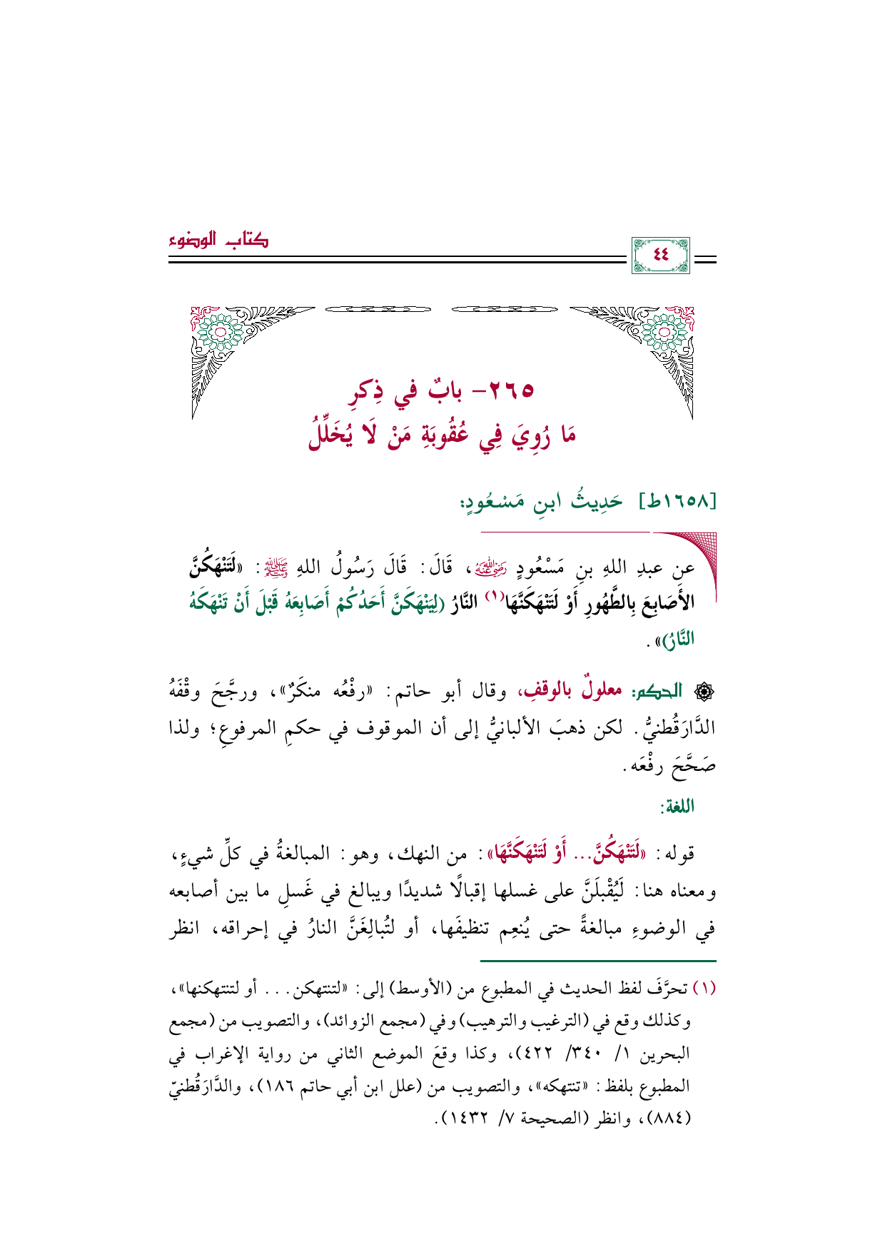 ◼ عن عبدِ اللهِ بنِ مَسْعُودٍ رضي الله عنه، قَالَ: قَالَ رَسُولُ اللهِ صلى الله عليه وسلم: «لَتَنْهَكُنَّ الأَصَابِعَ بِالطَّهُورِ أَوْ لَتَنْهَكَنَّهَا (¬١) النَّارُ (لِيَنْهَكَنَّ أَحَدُكُمْ أَصَابِعَهُ قَبْلَ أَنْ تَنْهَكَهُ النَّارُ)».