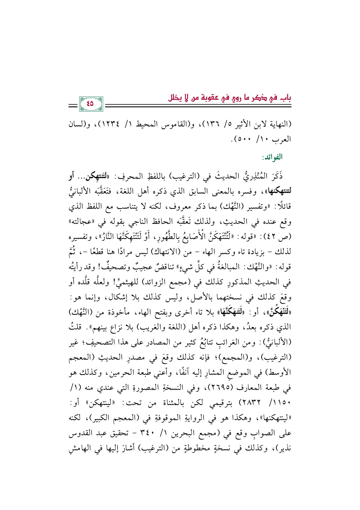 ذَكَرَ المُنْذِريُّ الحديثَ في (الترغيب) باللفظِ المحرفِ: «لتَنتهِكن ... أو لتنتهكنها»، وفسره بالمعنى السابق الذي ذكره أهل اللغة، فتَعَقَّبَه الألبانيُّ قائلًا: "وتفسير (النَّهْك) بما ذكر معروف، لكنه لا يتناسب مع اللفظ الذي وقع عنده في الحديثِ، ولذلك تَعقَّبَه الحافظ الناجي بقوله في «عجالته» (ص ٤٢): "قوله: «لَتُنْتَهَكَنَّ الْأَصَابِعُ بِالطَّهُورِ، أَوْ لَتَنْتَهِكَنَّهَا النَّارُ»، وتفسيره لذلك -بزيادة تاء وكسر الهاء- من (الانتهاك) ليس مرادًا هنا قطعًا -، ثُمَّ قوله: «والنَّهْك: المبالغةُ في كلِّ شيءٍ» تناقضٌ عجيبٌ وتصحيفٌ! وقد رأيتُه في الحديثِ المذكورِ كذلك في (مجمع الزوائد) للهيثميِّ! ولعلَّه قلَّده أو وقعَ كذلك في نسختهما بالأصل، وليس كذلك بلا إشكال، وإنما هو: «لَتَنْهَكُنَّ»، أو: «لَتَنهَكَنَّهَا» بلا تاء أخرى وبفتح الهاء، مأخوذة من (النَّهْك) الذي ذكره بعدُ، وهكذا ذكره أهل (اللغة والغريب) بلا نزاع بينهم". قلتُ (الألبانيُّ): ومن الغرائبِ تتابُعُ كثير من المصادر على هذا التصحيفِ؛ غير (الترغيب)، و (المجمع)؛ فإنه كذلك وقعَ في مصدرِ الحديثِ (المعجم الأوسط) في الموضعِ المشارِ إليه آنفًا، وأعني طبعة الحرمين، وكذلك هو في طبعة المعارف (٢٦٩٥)، وفي النسخةِ المصورةِ التي عندي منه (١/ ١١٥٠/ ٢٨٣٢) بترقيمي لكن بالمثناة من تحت: «لينتهكن» أو: «لينتهكنها»، وهكذا هو في الروايةِ الموقوفةِ في (المعجم الكبير)، لكنه على الصوابِ وقع في (مجمع البحرين ١/ ٣٤٠ - تحقيق عبد القدوس نذير)، وكذلك في نسخةٍ مخطوطةٍ من (الترغيب) أشارَ إليها في الهامشِ