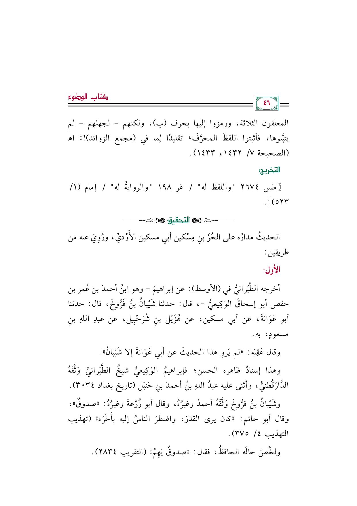 أخرجه الطَّبَرانيُّ في (الأوسط): عن إبراهيمَ -وهو ابنُ أحمدَ بن عُمر بن حفص أبو إسحاقَ الوَكِيعيُّ-، قال: حدثنا شَيْبانُ بنُ فَرُّوخَ، قال: حدثنا أبو عَوَانةَ، عن أبي مسكين، عن هُزَيْل بنِ شُرَحْبِيل، عن عبدِ اللهِ بنِ مسعودٍ، به.