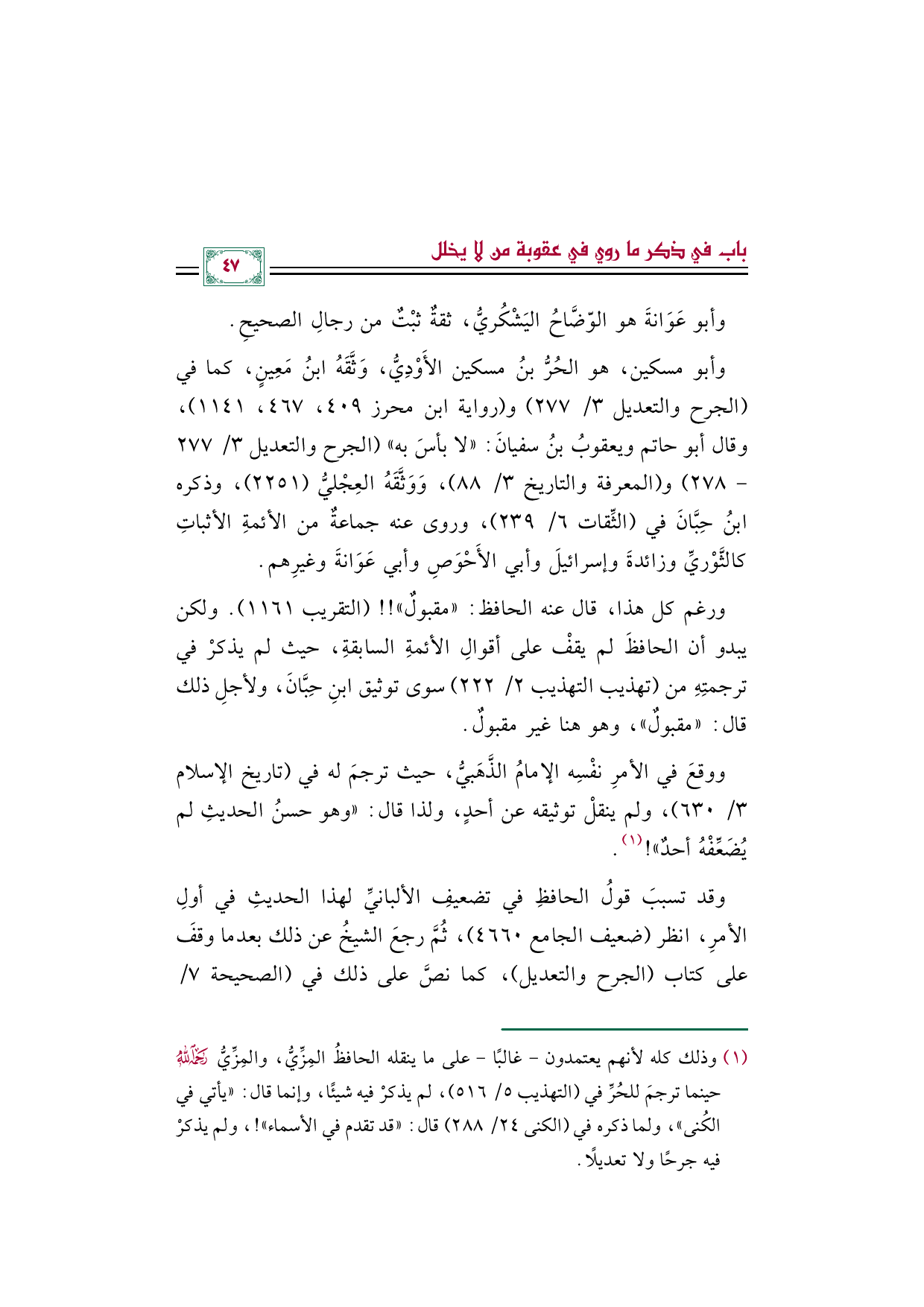 (¬١) وذلك كله لأنهم يعتمدون -غالبًا- على ما ينقله الحافظُ المِزِّيُّ، والمِزِّيُّ رحمه الله حينما ترجمَ للحُرِّ في (التهذيب ٥/ ٥١٦)، لم يذكرْ فيه شيئًا، وإنما قال: "يأتي في الكُنى"، ولما ذكره في (الكنى ٢٤/ ٢٨٨) قال: "قد تقدم في الأسماء"! ، ولم يذكرْ فيه جرحًا ولا تعديلًا.