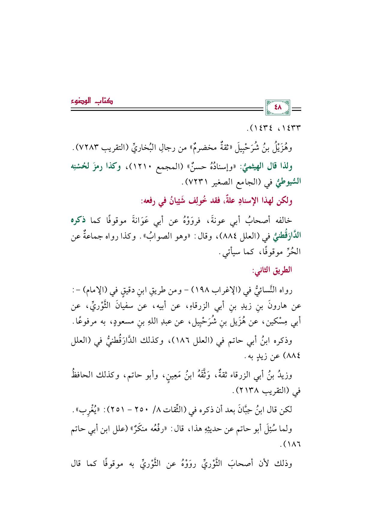 رواه النَّسائيُّ في (الإغراب ١٩٨) -ومن طريقِ ابنِ دقيقٍ في (الإمام) -: عن هارونَ بنِ زيدِ بنِ أبي الزرقاءِ، عن أبيه، عن سفيانَ الثَّوْريِّ، عن أبي مِسْكين، عن هُزَيل بنِ شُرَحْبِيل، عن عبدِ اللهِ بنِ مسعودٍ، به مرفوعًا.