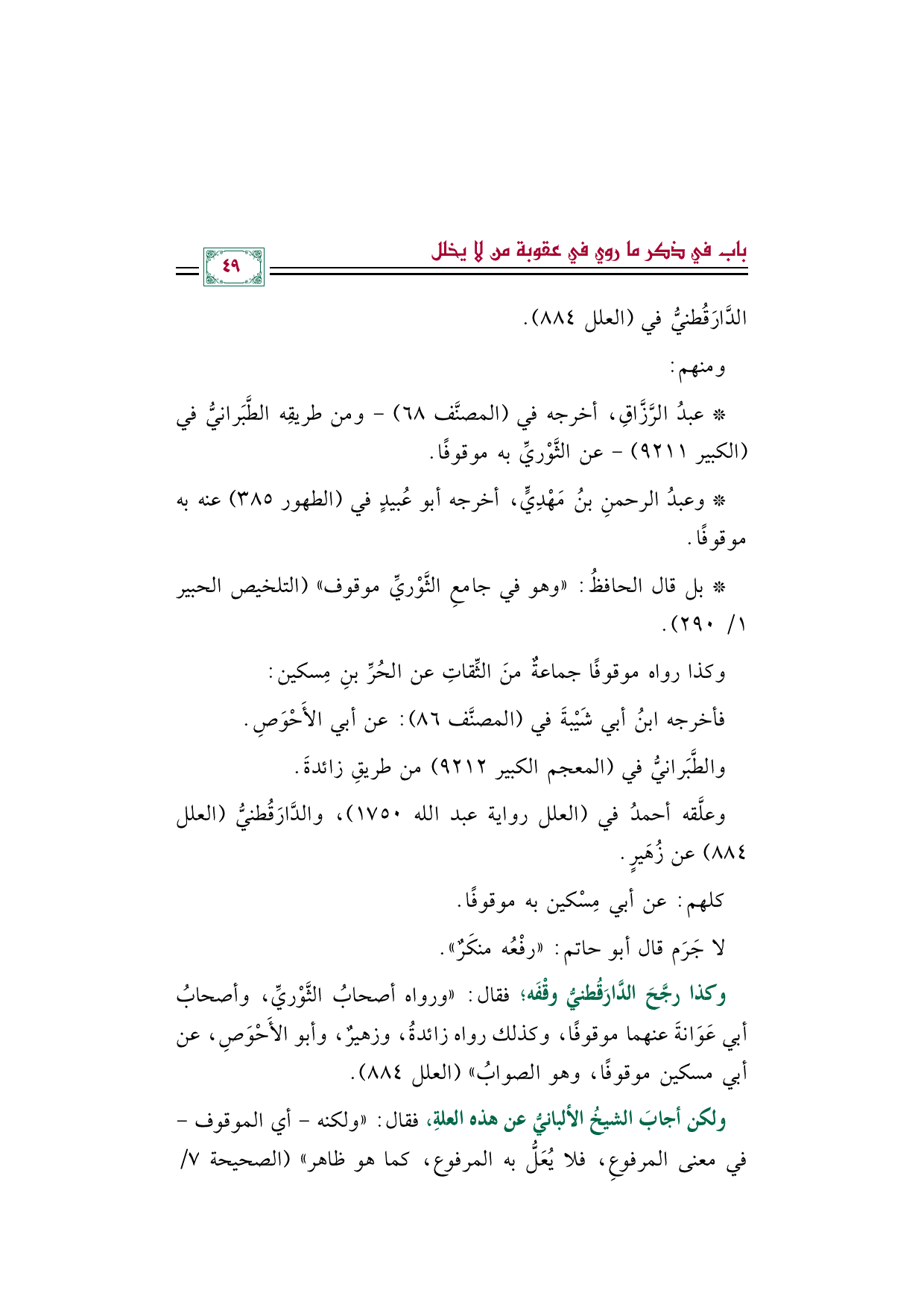 وكذا رجَّحَ الدَّارَقُطنيُّ وقْفَه؛ فقال: "ورواه أصحابُ الثَّوْريِّ، وأصحابُ أبي عَوَانةَ عنهما موقوفًا، وكذلك رواه زائدةُ، وزهيرٌ، وأبو الأَحْوَصِ، عن أبي مسكين موقوفًا، وهو الصوابُ" (العلل ٨٨٤).