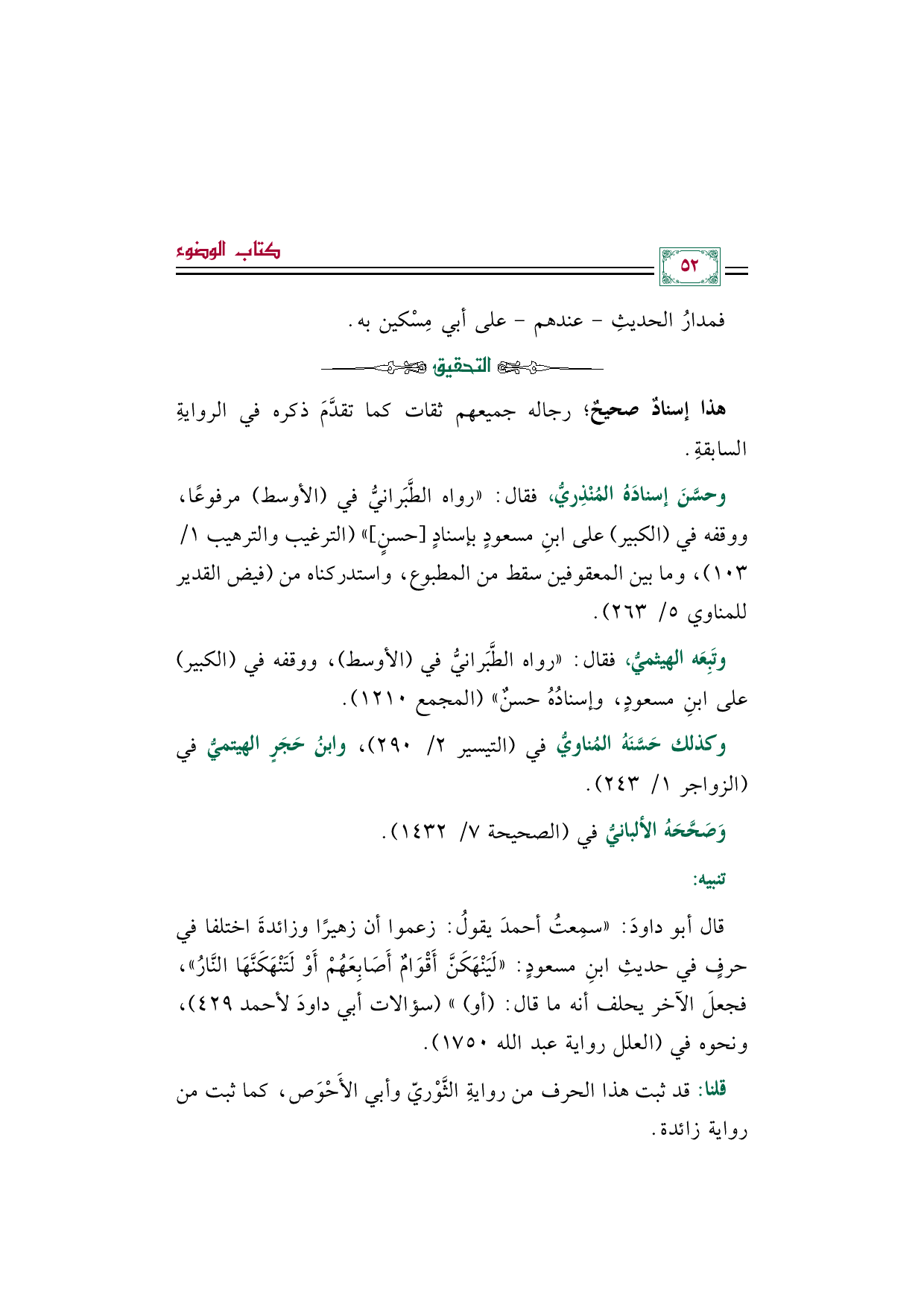 وحسَّنَ إسنادَهُ المُنْذِريُّ، فقال: "رواه الطَّبَرانيُّ في (الأوسط) مرفوعًا، ووقفه في (الكبير) على ابنِ مسعودٍ بإسنادٍ [حسنٍ] " (الترغيب والترهيب ١/ ١٠٣)، وما بين المعقوفين سقط من المطبوع، واستدركناه من (فيض القدير للمناوي ٥/ ٢٦٣).