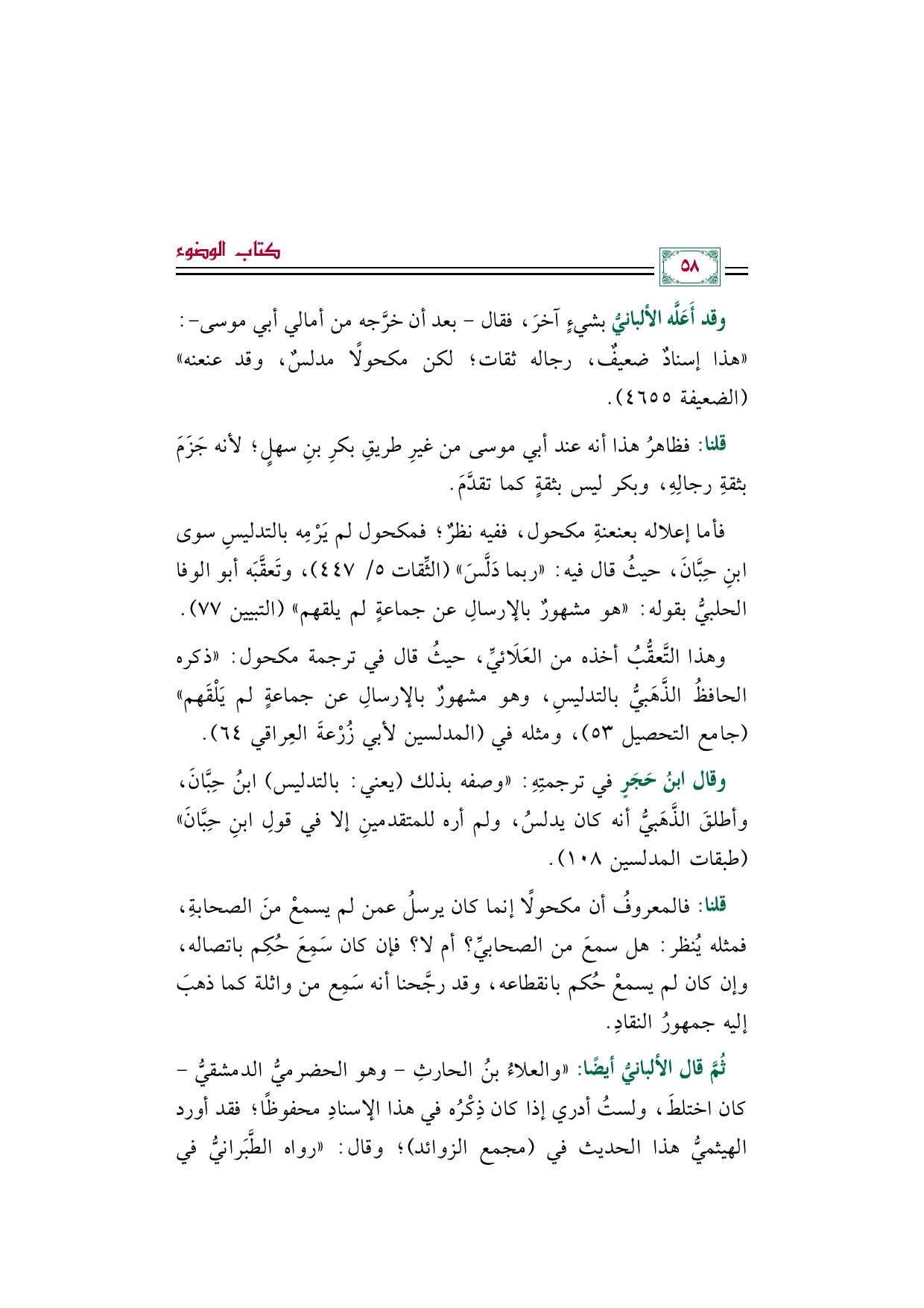 قلنا: فالمعروفُ أن مكحولًا إنما كان يرسلُ عمن لم يسمعْ منَ الصحابةِ، فمثله يُنظر: هل سمعَ من الصحابيِّ؟ أم لا؟ فإن كان سَمِعَ حُكِم باتصاله، وإن كان لم يسمعْ حُكم بانقطاعه، وقد رجَّحنا أنه سَمِع من واثلة كما ذهبَ إليه جمهورُ النقادِ.