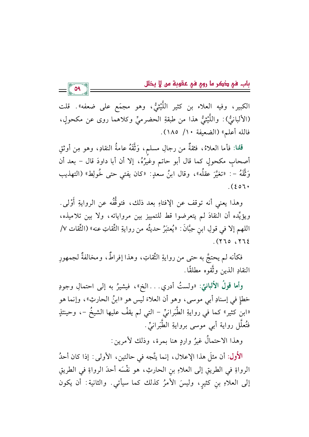 وأما قولُ الألبانيِّ: "ولستُ أدري ... الخ"، فيشيرُ به إلى احتمالِ وجودِ خطإٍ في إسنادِ أبي موسى، وهو أن العلاءَ ليس هو "ابنُ الحارثِ"، وإنما هو "ابن كثير" كما في روايةِ الطَّبَرانيِّ -التي لم يقفْ عليها الشيخُ-، وحينئذٍ فتُعلَّل رواية أبي موسى بروايةِ الطَّبَرانيِّ.