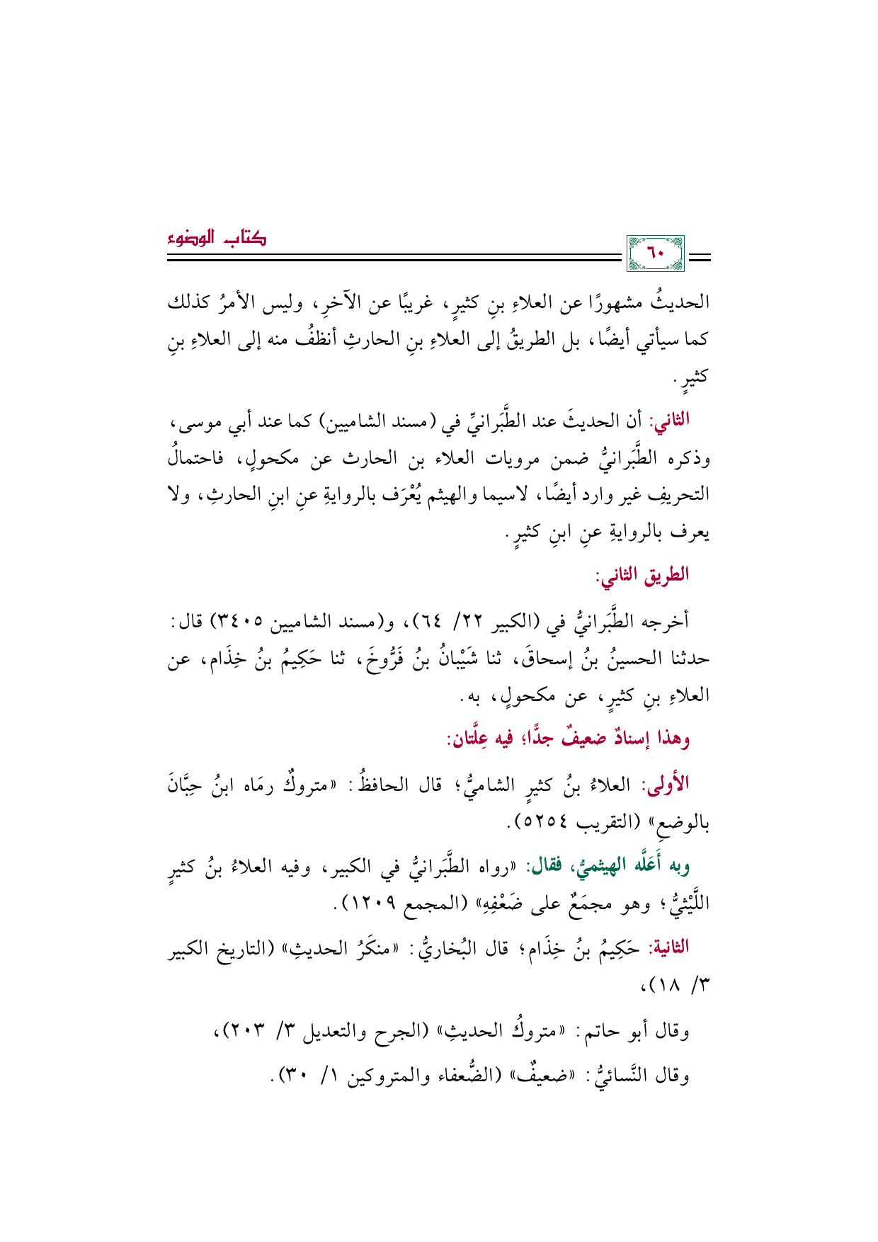 الثاني: أن الحديثَ عند الطَّبَرانيِّ في (مسند الشاميين) كما عند أبي موسى، وذكره الطَّبَرانيُّ ضمن مرويات العلاء بن الحارث عن مكحولٍ، فاحتمالُ التحريفِ غير وارد أيضًا، لاسيما والهيثم يُعْرَف بالروايةِ عنِ ابنِ الحارثِ، ولا يعرف بالروايةِ عنِ ابنِ كثيرٍ.
