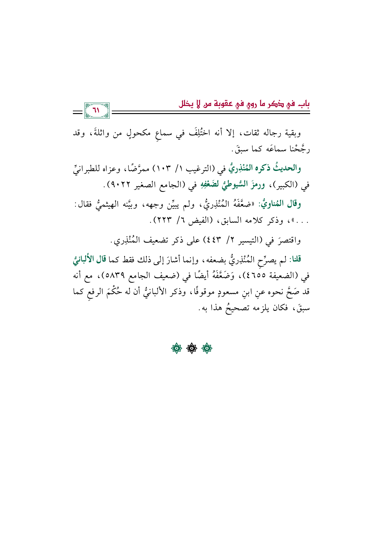 قلنا: لم يصرِّحِ المُنْذِريُّ بضعفه، وإنما أشارَ إلى ذلك فقط كما قال الألبانيُّ في (الضعيفة ٤٦٥٥)، وَضَعَّفَهُ أيضًا في (ضعيف الجامع ٥٨٣٩)، مع أنه قد صَحَّ نحوه عنِ ابنِ مسعودٍ موقوفًا، وذكر الألبانيُّ أن له حُكْمَ الرفعِ كما سبقَ، فكان يلزمه تصحيحُ هذا به.