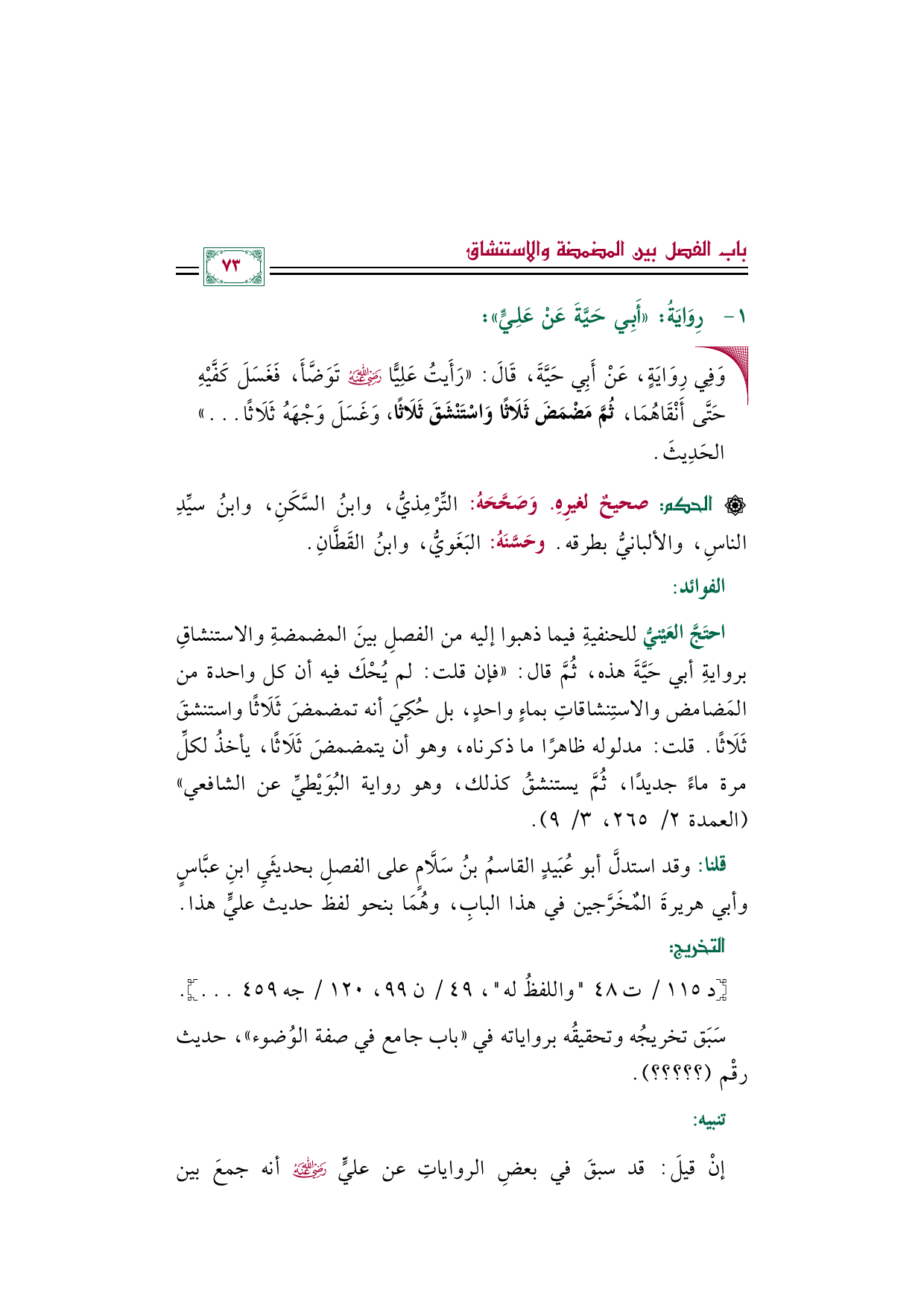 احتَجَّ العَيْنيُّ للحنفيةِ فيما ذهبوا إليه من الفصلِ بينَ المضمضةِ والاستنشاقِ بروايةِ أبي حَيَّةَ هذه، ثُمَّ قال: "فإن قلت: لم يُحْكَ فيه أن كل واحدة من المَضامض والاستِنشاقاتِ بماءٍ واحدٍ، بل حُكِيَ أنه تمضمضَ ثَلَاثًا واستنشقَ ثَلَاثًا. قلت: مدلوله ظاهرًا ما ذكرناه، وهو أن يتمضمضَ ثَلَاثًا، يأخذُ لكلِّ مرة ماءً جديدًا، ثُمَّ يستنشقُ كذلك، وهو رواية البُوَيْطيِّ عن الشافعي" (العمدة ٢/ ٢٦٥، ٣/ ٩).