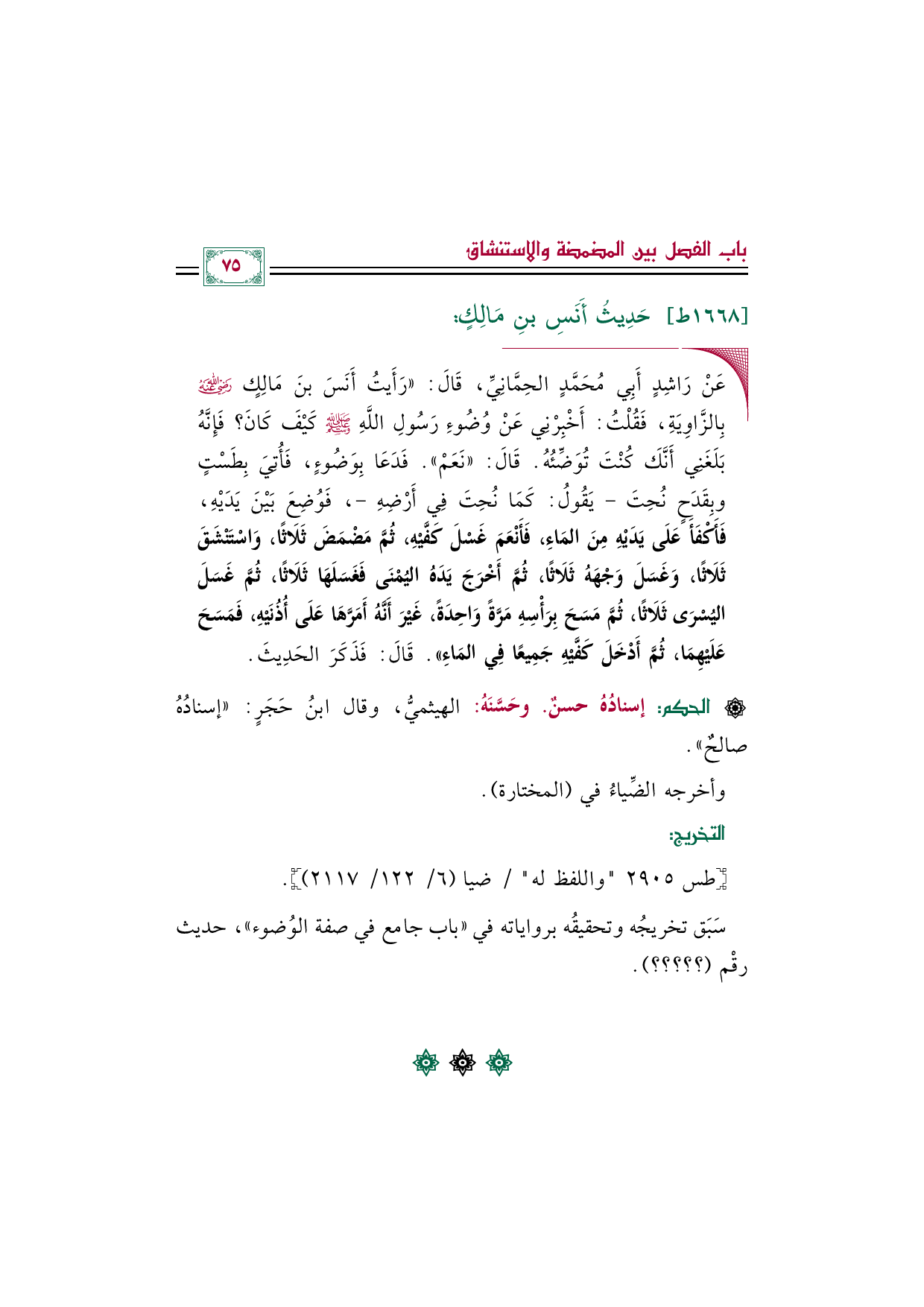 ◼ عَنْ رَاشِدٍ أَبِي مُحَمَّدٍ الحِمَّانِيِّ، قَالَ: ((رَأَيتُ أَنَسَ بنَ مَالِكٍ رضي الله عنه بِالزَّاوِيَةِ، فَقُلْتُ: أَخْبِرْنِي عَنْ وُضُوءِ رَسُولِ اللَّهِ صلى الله عليه وسلم كَيْفَ كَانَ؟ فَإِنَّهُ بَلَغَنِي أَنَّكَ كُنْتَ تُوَضِّئُهُ. قَالَ: «نَعَمْ». فَدَعَا بِوَضُوءٍ، فَأُتِيَ بِطَسْتٍ وبِقَدَحٍ نُحِتَ -يَقُولُ: كَمَا نُحِتَ فِي أَرْضِهِ-، فَوُضِعَ بَيْنَ يَدَيْهِ، فَأَكْفَأَ عَلَى يَدَيْهِ مِنَ المَاءِ، فَأَنْعَمَ غَسْلَ كَفَّيْهِ، ثُمَّ مَضْمَضَ ثَلَاثًا، وَاسْتَنْشَقَ ثَلَاثًا، وَغَسَلَ وَجْهَهُ ثَلَاثًا، ثُمَّ أَخْرَجَ يَدَهُ اليُمْنَى فَغَسَلَهَا ثَلَاثًا، ثُمَّ غَسَلَ اليُسْرَى ثَلَاثًا، ثُمَّ مَسَحَ بِرَأْسِهِ مَرَّةً وَاحِدَةً، غَيْرَ أَنَّهُ أَمَرَّهَا عَلَى أُذُنَيْهِ، فَمَسَحَ عَلَيْهِمَا، ثُمَّ أَدْخَلَ كَفَّيْهِ جَمِيعًا فِي المَاءِ)). قَالَ: فَذَكَرَ الحَدِيثَ.