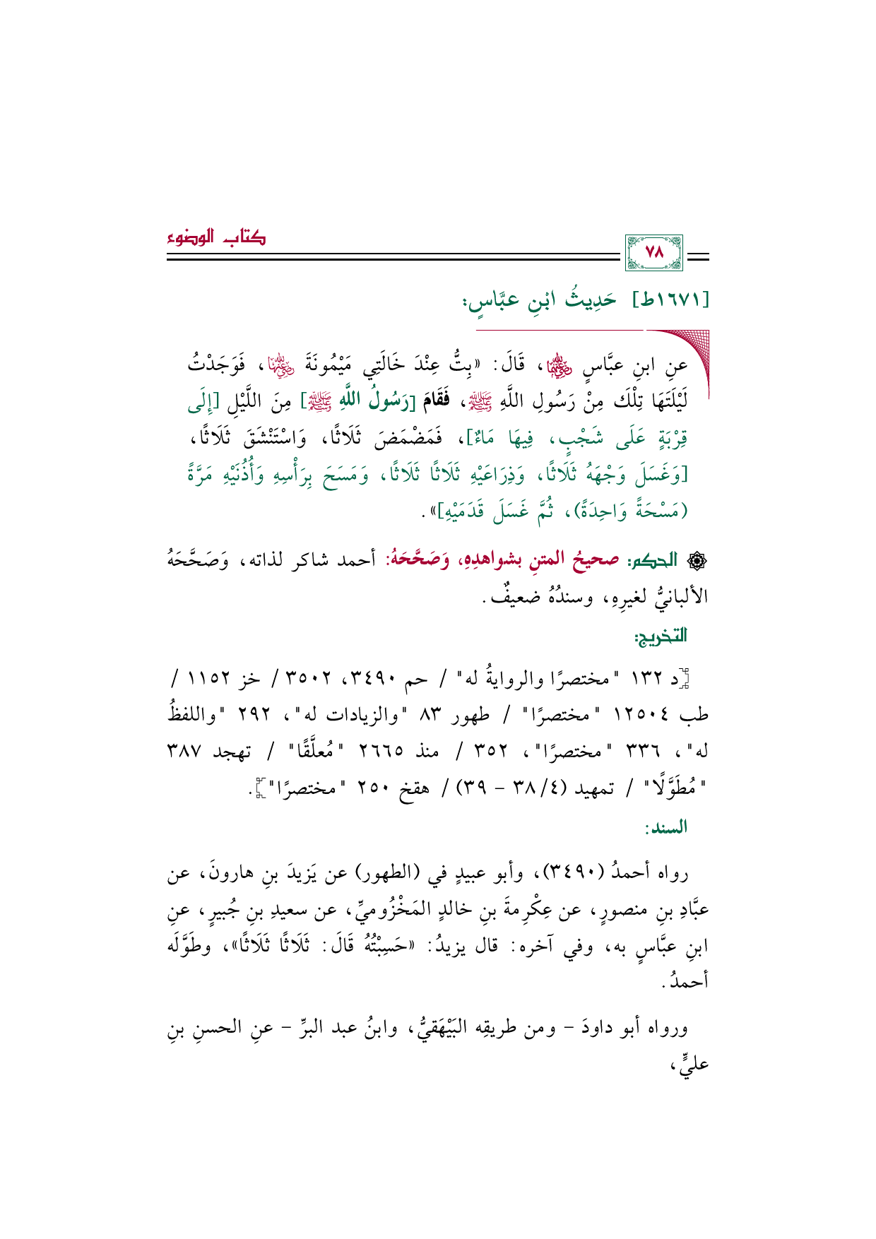رواه أحمدُ (٣٤٩٠)، وأبو عبيدٍ في (الطهور) عن يَزيدَ بنِ هارونَ، عن عبَّادِ بنِ منصورٍ، عن عِكْرِمةَ بنِ خالدٍ المَخْزُوميِّ، عن سعيدِ بنِ جُبيرٍ، عنِ ابنِ عبَّاسٍ به، وفي آخره: قال يزيدُ: "حَسِبْتُهُ قَالَ: ثَلَاثًا ثَلَاثًا"، وطَوَّلَه أحمدُ.