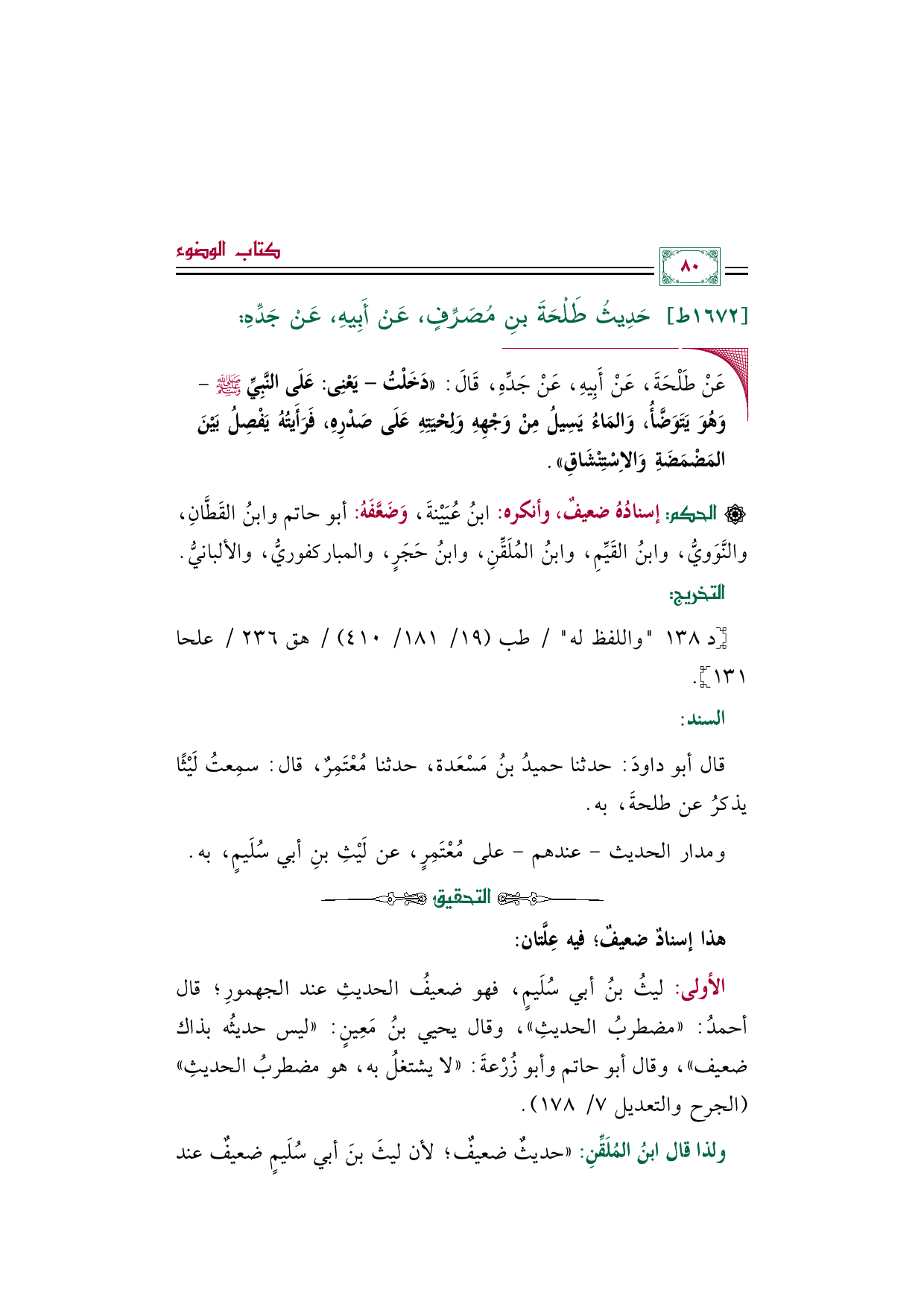 ولذا قال ابنُ المُلَقِّنِ: "حديثٌ ضعيفٌ؛ لأن ليثَ بنَ أبي سُلَيمٍ ضعيفٌ عند