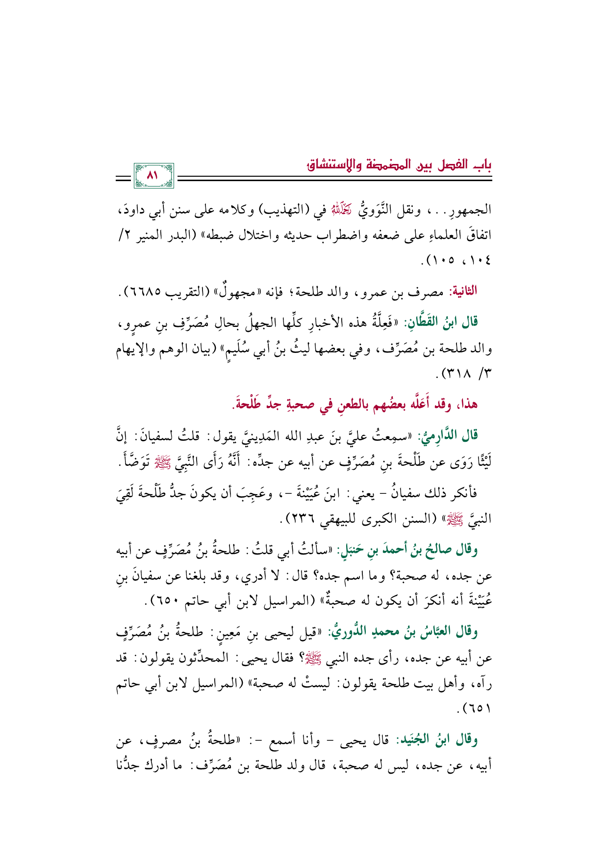 الثانية: مصرف بن عمرو، والد طلحة؛ فإنه "مجهولٌ" (التقريب ٦٦٨٥).