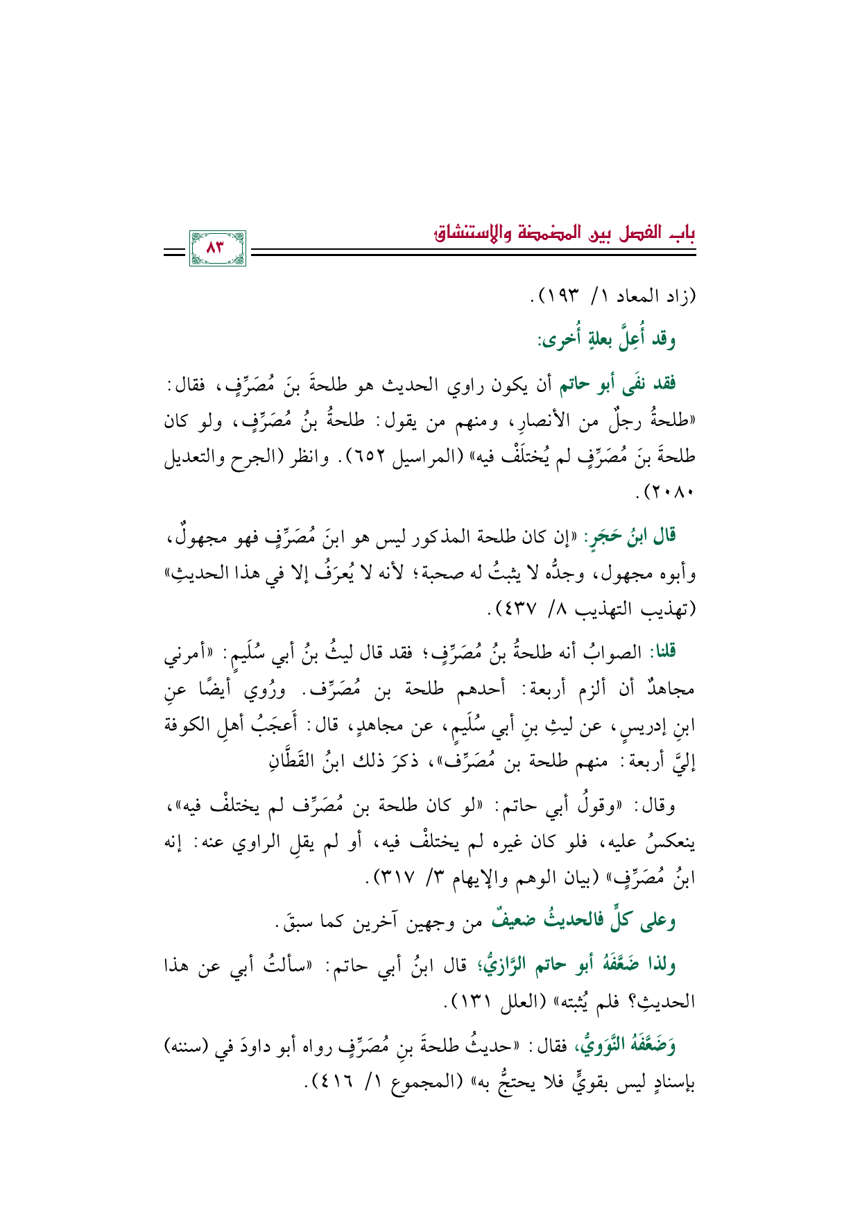 فقد نفَى أبو حاتم أن يكون راوي الحديث هو طلحةَ بنَ مُصَرِّفٍ، فقال: "طلحةُ رجلٌ من الأنصارِ، ومنهم من يقول: طلحةُ بنُ مُصَرِّفٍ، ولو كان طلحةَ بنَ مُصَرِّفٍ لم يُختلَفْ فيه" (المراسيل ٦٥٢). وانظر (الجرح والتعديل ٢٠٨٠).