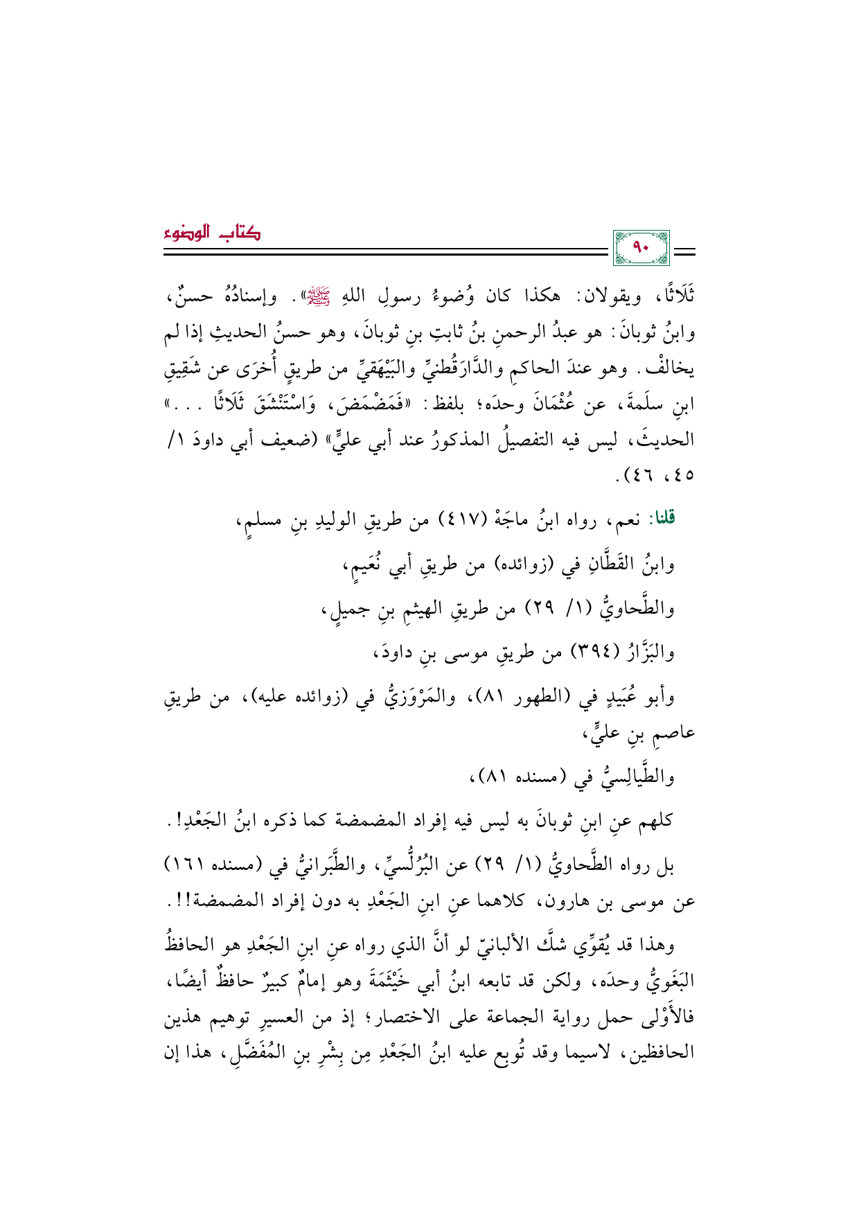 ثَلَاثًا، ويقولان: هكذا كان وُضوءُ رسولِ اللهِ صلى الله عليه وسلم». وإسنادُهُ حسنٌ، وابنُ ثوبانَ: هو عبدُ الرحمنِ بنُ ثابتِ بنِ ثوبانَ، وهو حسنُ الحديثِ إذا لم يخالفْ. وهو عندَ الحاكمِ والدَّارَقُطنيِّ والبَيْهَقيِّ من طريقٍ أُخرَى عن شَقِيقِ بنِ سلَمةَ، عن عُثْمَانَ وحدَه؛ بلفظ: «فَمَضْمَضَ، وَاسْتَنْشَقَ ثَلَاثًا ... » الحديثَ، ليس فيه التفصيلُ المذكورُ عند أبي عليٍّ" (ضعيف أبي داودَ ١/ ٤٥، ٤٦).