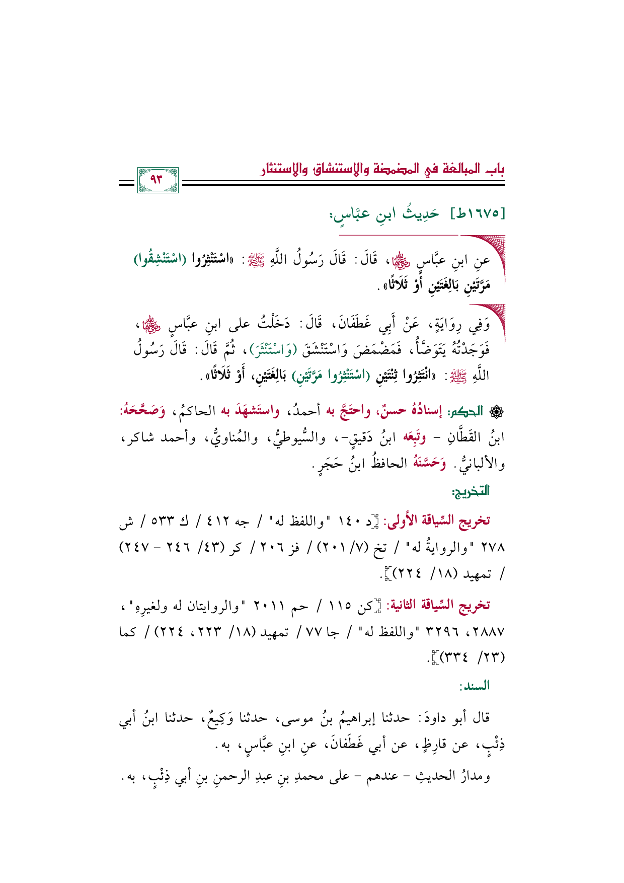 ◼ عنِ ابنِ عبَّاسٍ رضي الله عنهما، قَالَ: قَالَ رَسُولُ اللَّهِ صلى الله عليه وسلم: «اسْتَنْثِرُوا (اسْتَنْشِقُوا) مَرَّتَيْنِ بَالِغَتَيْنِ أَوْ ثَلَاثًا».