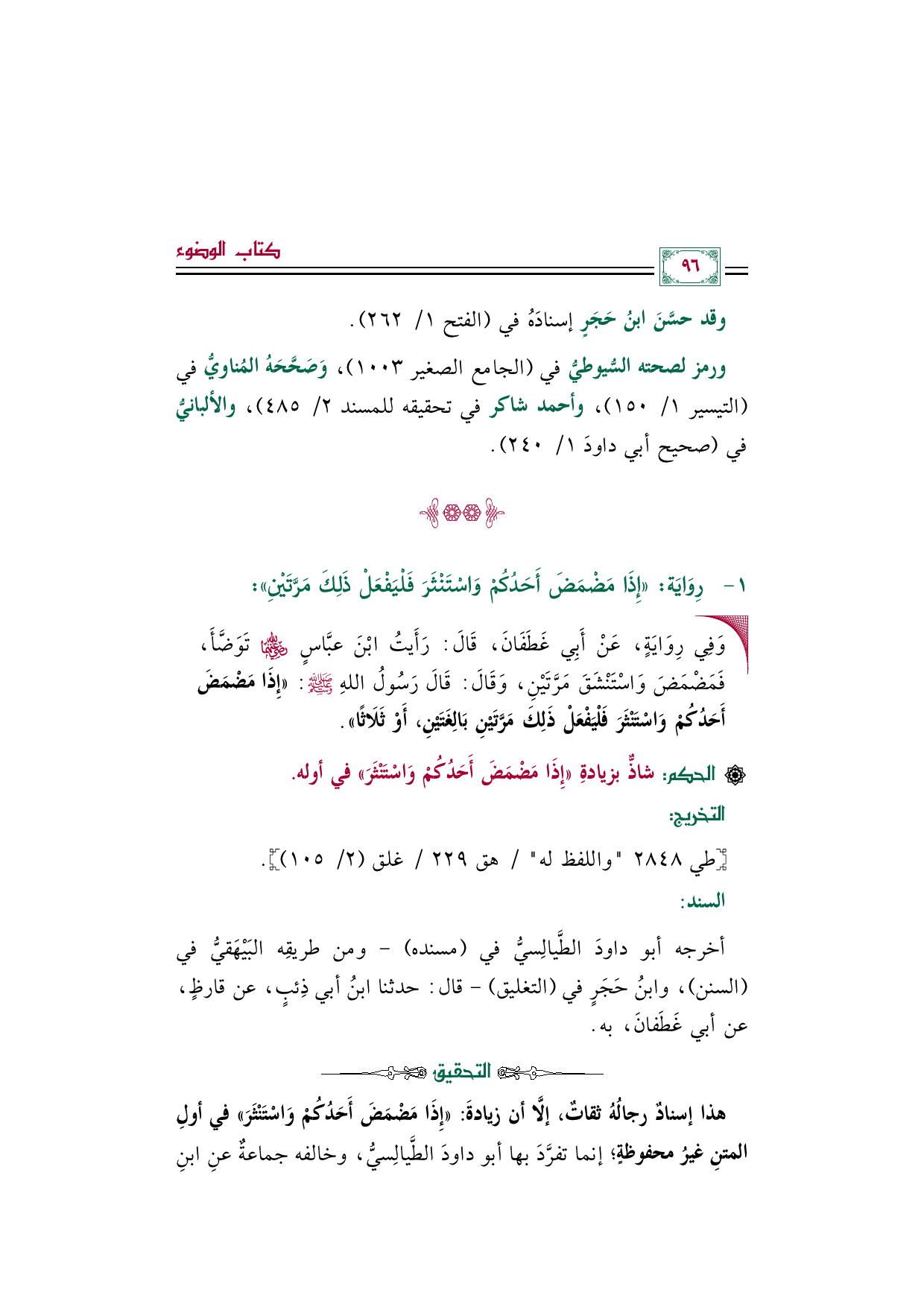 ورمز لصحته السُّيوطيُّ في (الجامع الصغير ١٠٠٣)، وَصَحَّحَهُ المُناويُّ في (التيسير ١/ ١٥٠)، وأحمد شاكر في تحقيقه للمسند ٢/ ٤٨٥)، والألبانيُّ في (صحيح أبي داودَ ١/ ٢٤٠).